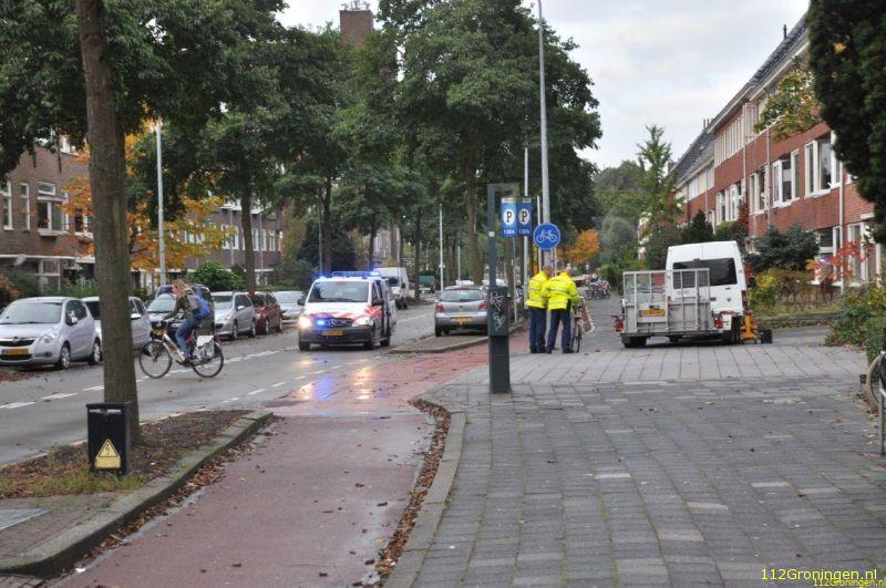 Een meisje was geschept door een auto van de Gemeente Groningen. De automobilist zag haar over het hoofd bij het oversteken. Ze werd met onbekend letsel naar een ziekenhuis gebracht. De auto kon al snel weer zijn weg vervolgen en staat niet op de foto. De fiets is later opgehaald. De Voa maakte rapport op.