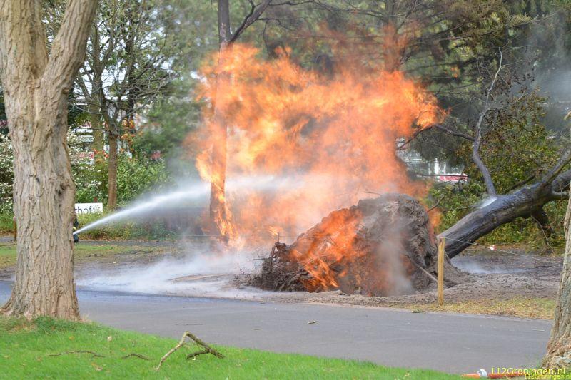 Zuidlaren - Bij het appartementencomplex Nieuw Laarhof in Zuidlaren was maandagmiddag brand uitgebroken nadat een boom omwaaide en daardoor een gasleiding kapot trok.