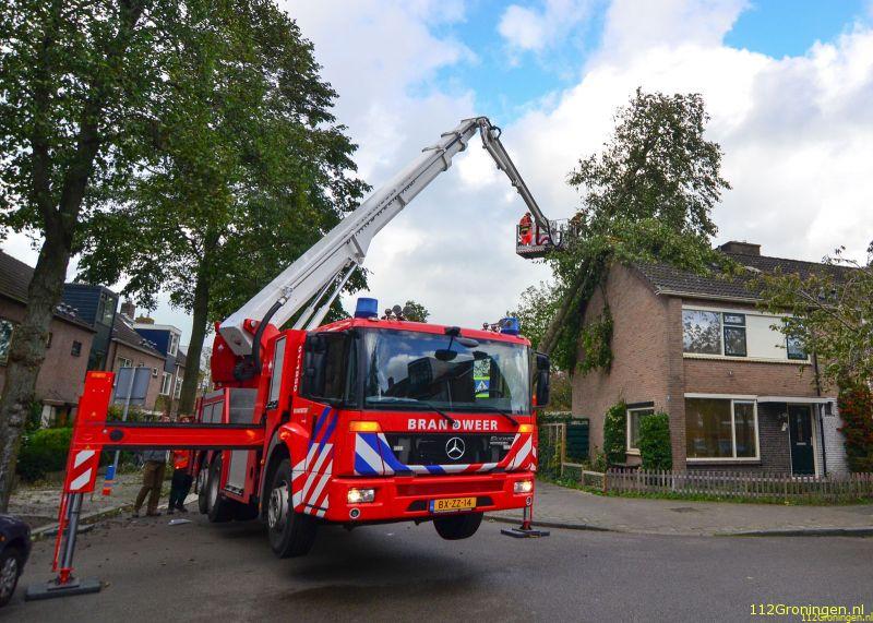 Popdijkemaweg: Hier stond een boom tegen de woning op, de bewoners hebben enige tijd moeten wachten tot de boomruimers terplaatse kwamen.