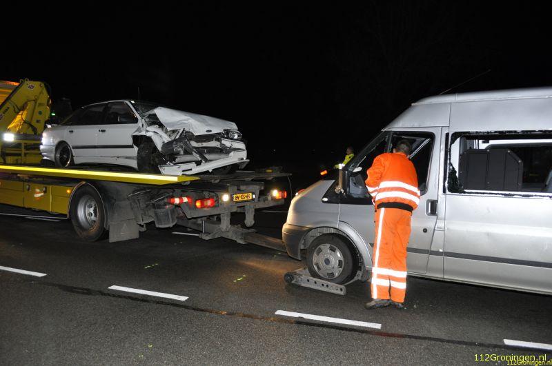 Een auto reed in de richting van Uithuizermeeden toen er een busje met meerdere inzittenden onverwachts  overstak richting Uithuizen dit tot een grote aanrijding als gevolg.