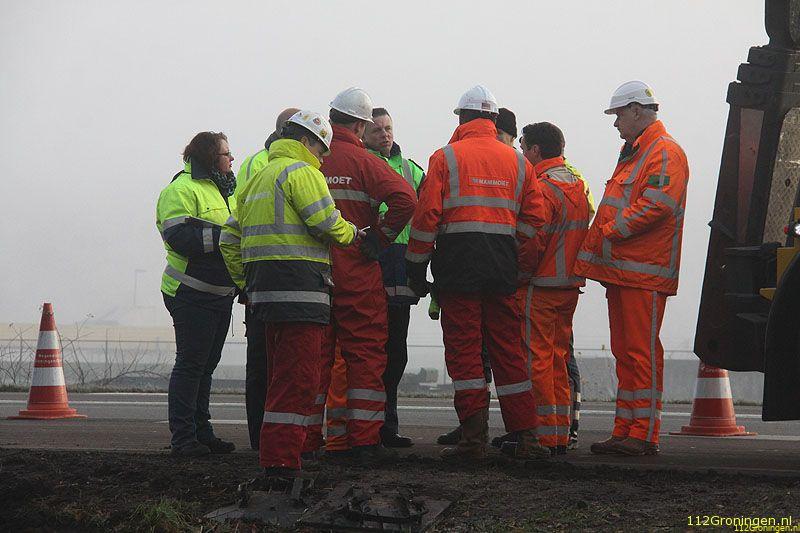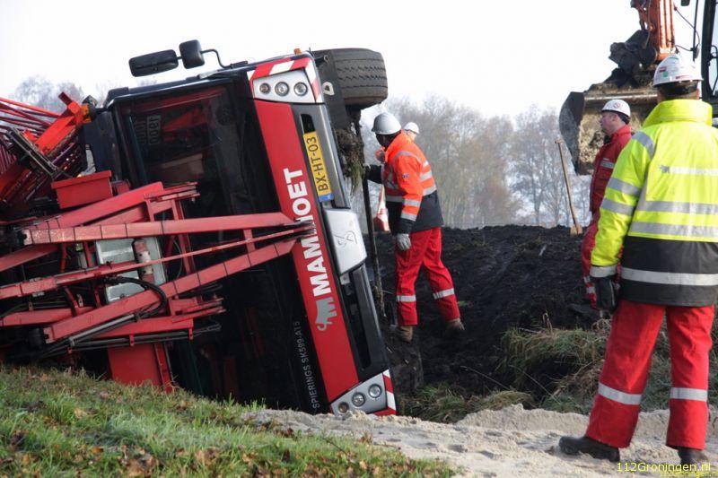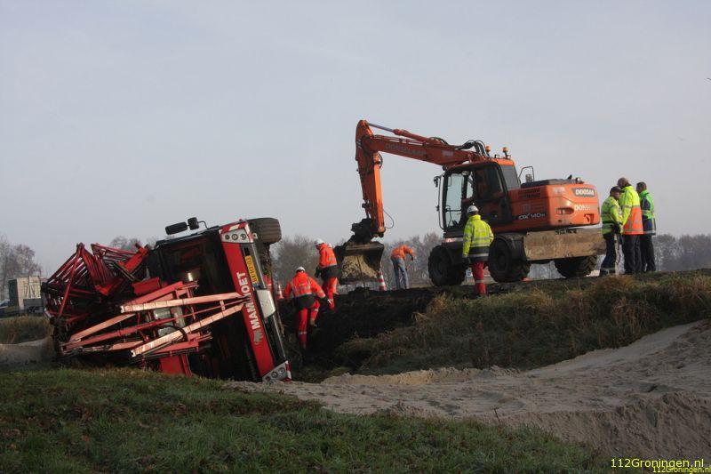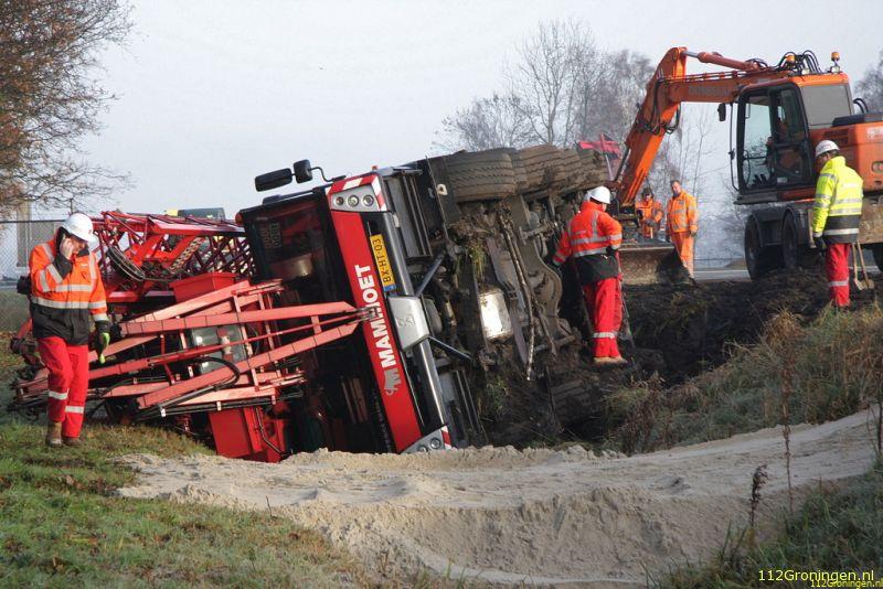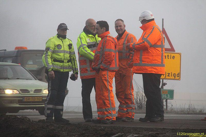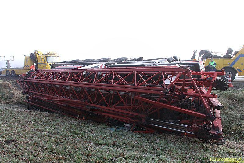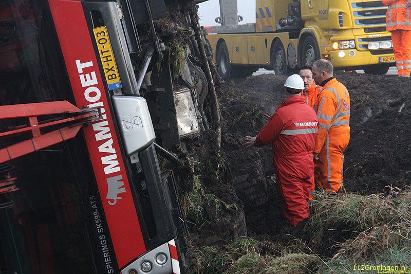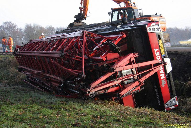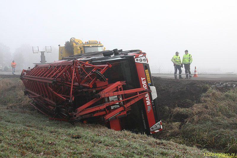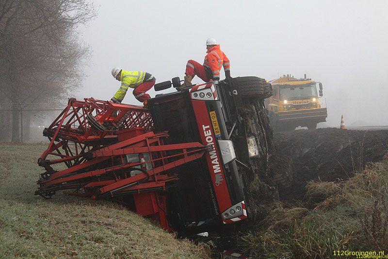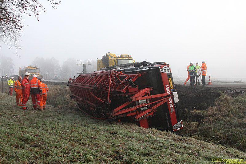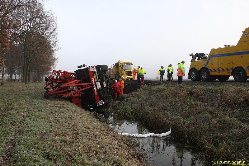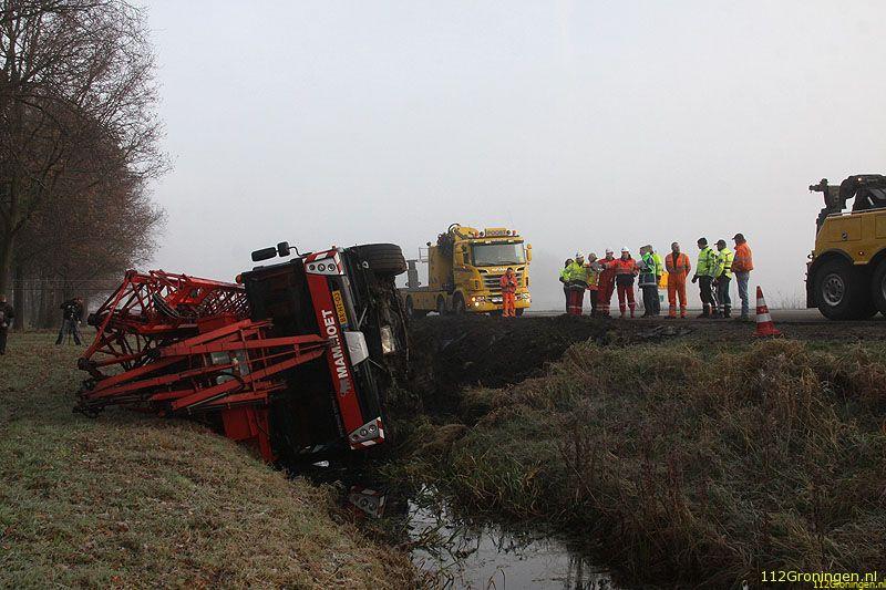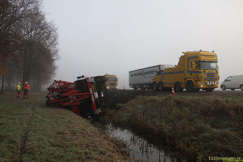 De chauffeur raakte in de mist naast de weg en verloor de controle over het voertuig, de kraan kantelde en eindigde in de sloot. De kraan wordt dinsdagavond rond 20:00 uur geborgen, de N33 word hiervoor volledig afgesloten.