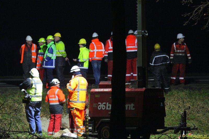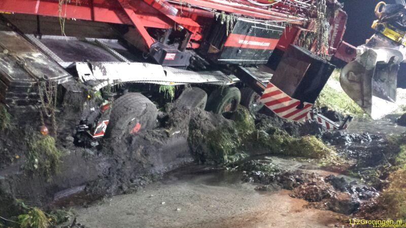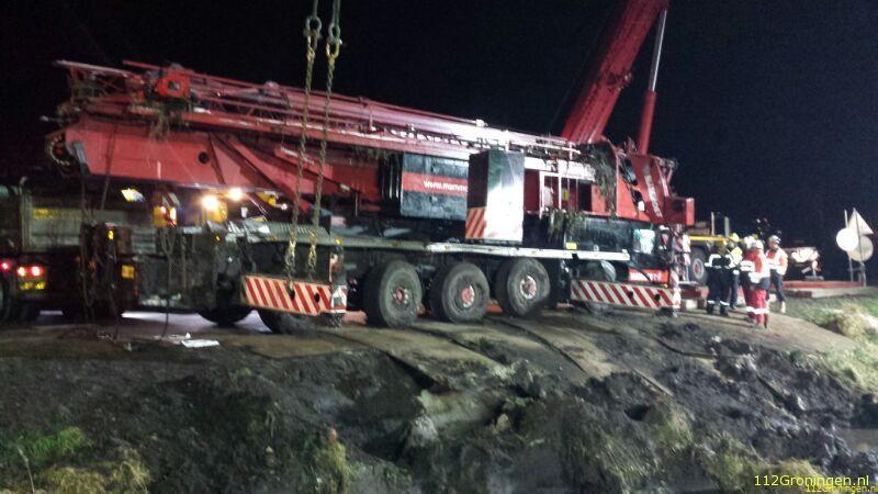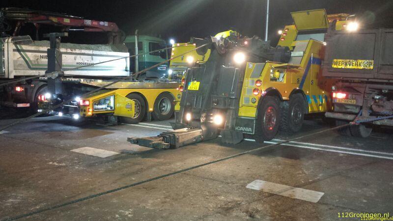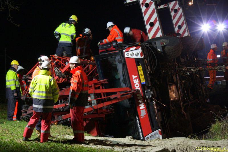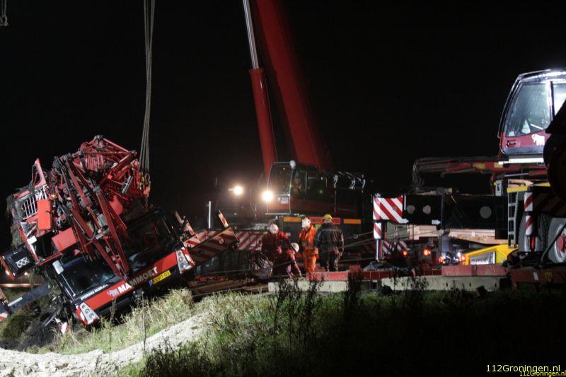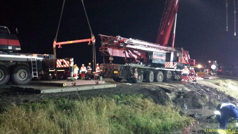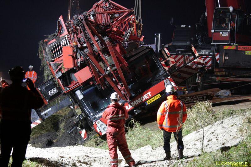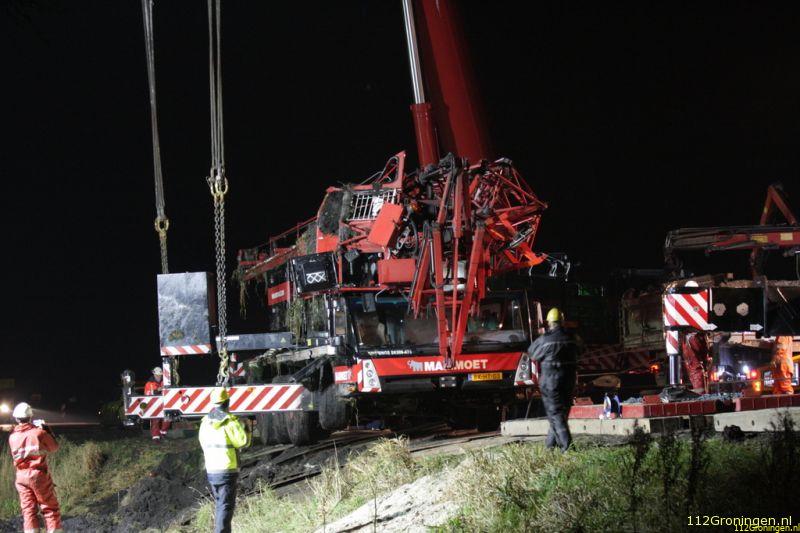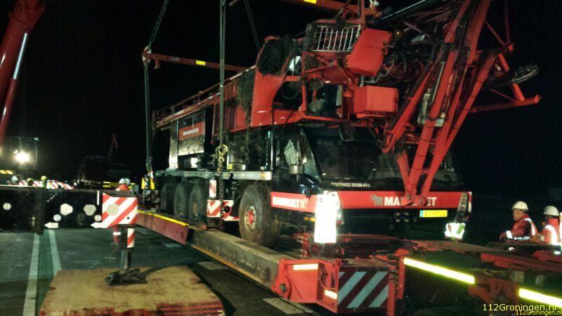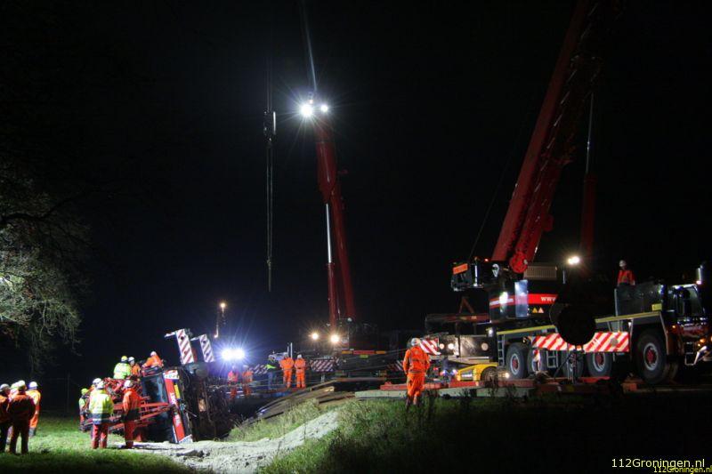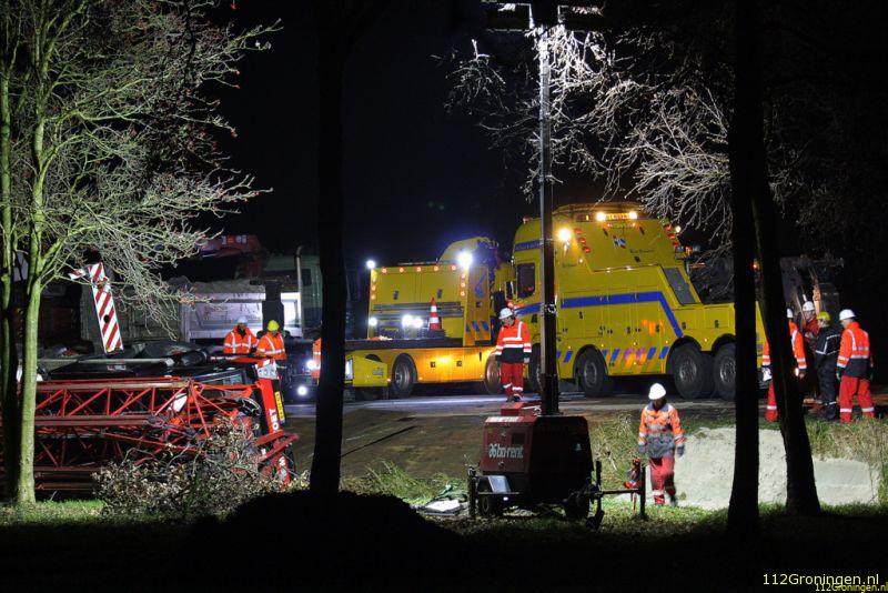Veendam - Dinsdagavond en nacht is er met man en macht gewerkt aan de berging van de gekantelde kraan op de N33 bij Veendam.
