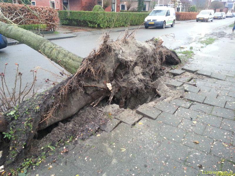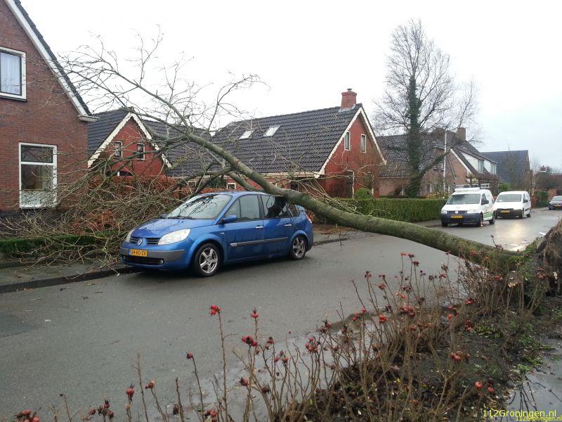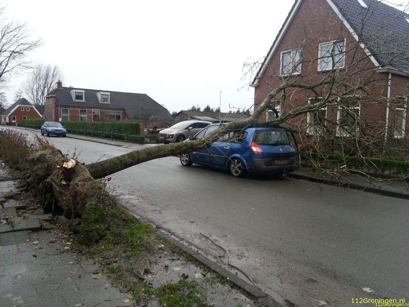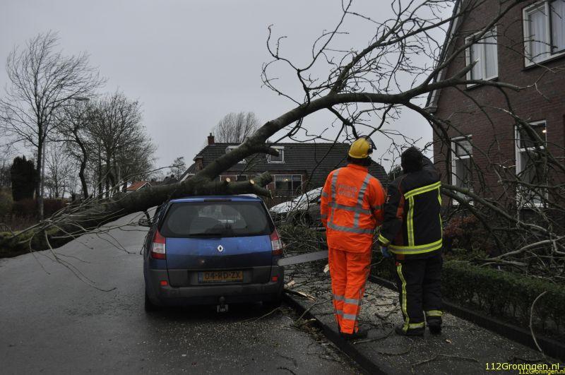 Uithuizen - Donderdagmiddag is op de Lageweg in Uithuizen een boom op een auto gevallen. Wonder boven wonder raakte daarbij niemand gewond.