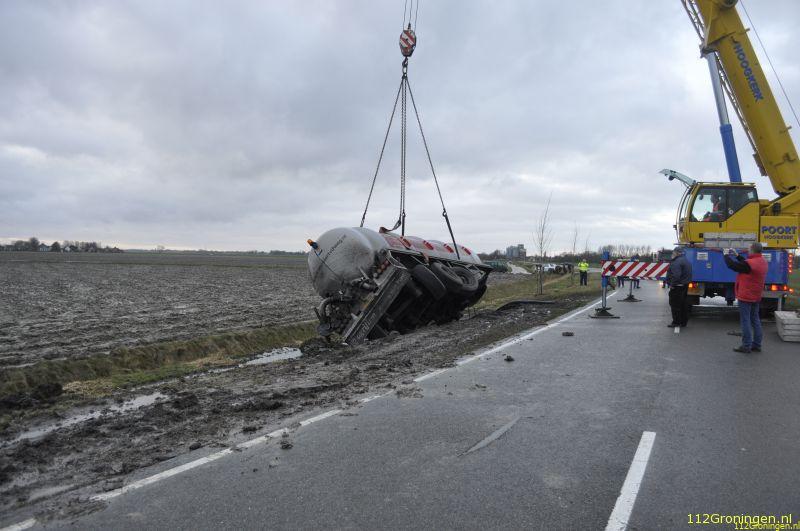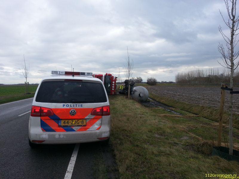 De tankwagen is in de sloot gerold. Het stinkt ter plaatse behoorlijk naar mest en diesel. Poort uit Hoogkerk gaat de vrachtwagen bergen. Het verkeer ondervond enige overlast van de berging.