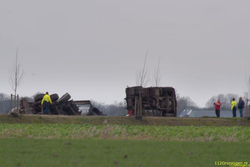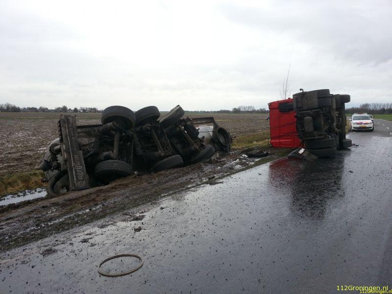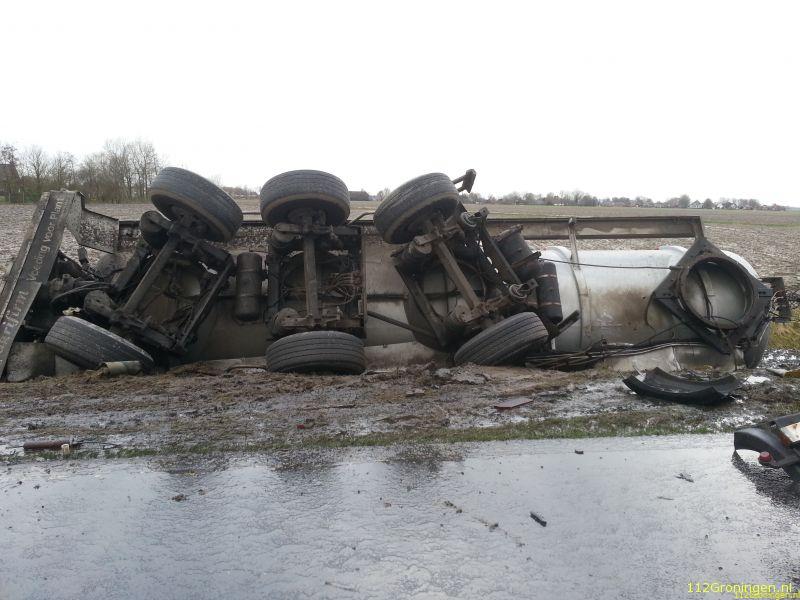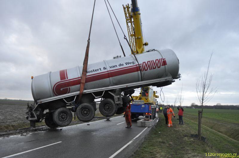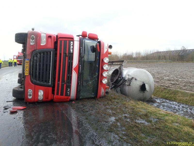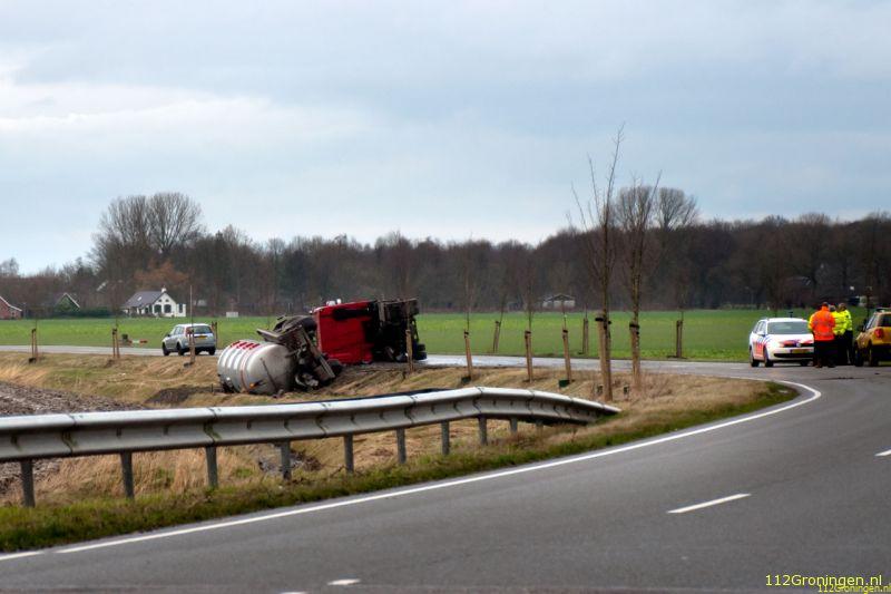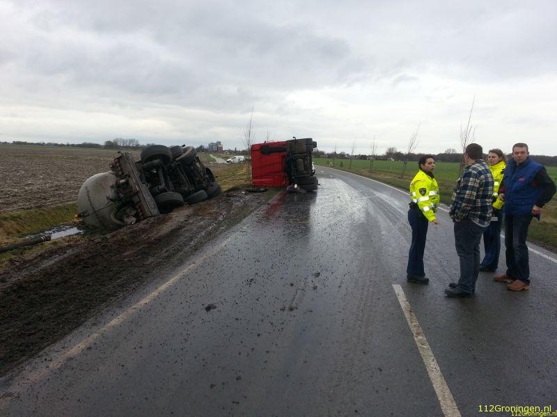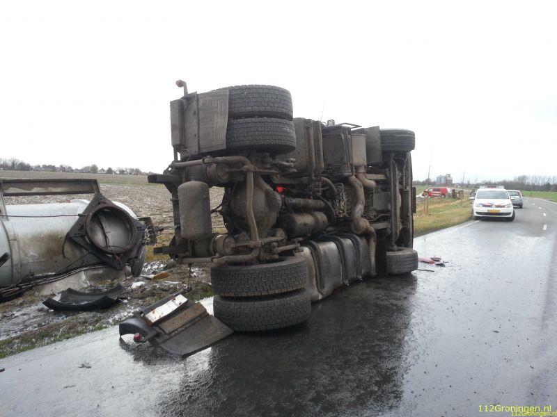 Zandeweer - Op de N999 bij Zandeweer is donderdag een vrachtwagen met een tank vol varkensmest gekanteld.