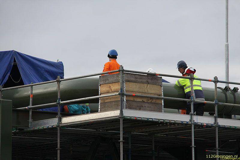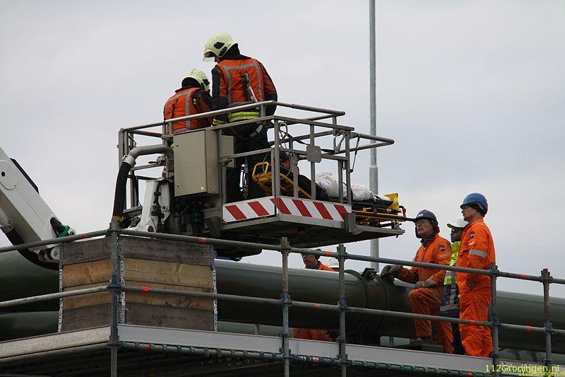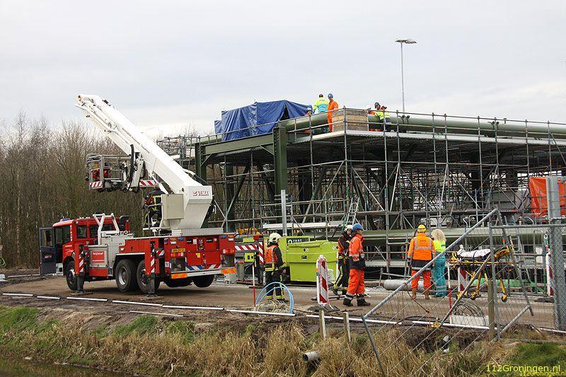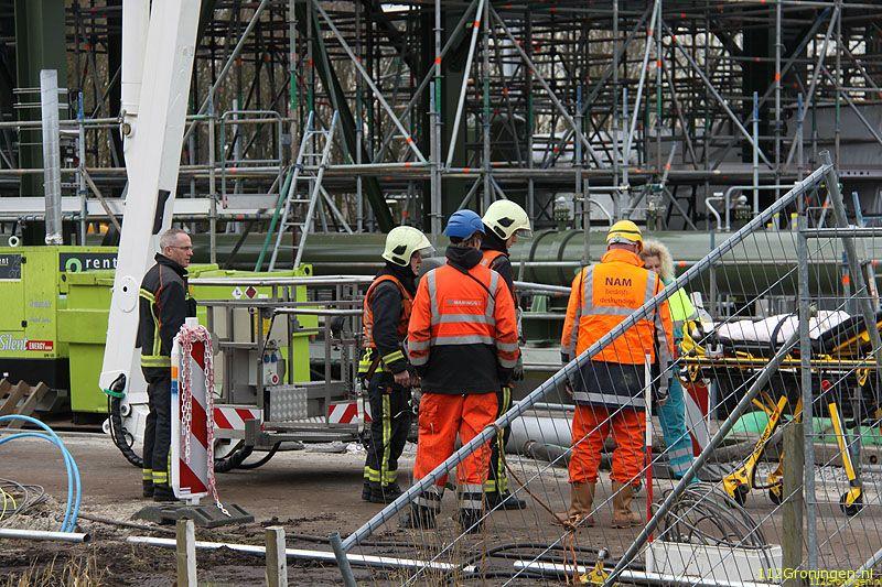 Het incident gebeurde achter het kantoor van de NAM aan de Vosholen in Sappemeer. Het is niet bekend of er sprake is van een onwelwording of dat de man tijdens het werk gewond is geraakt. Het slachtoffer is nadat hij door de brandweer naar beneden was gehaald met onbekende verwondingen overgebracht naar het ziekenhuis in de stad Groningen.