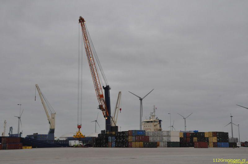 Het schip wordt geladen met 2 lagen voertuigen en een laag containers.