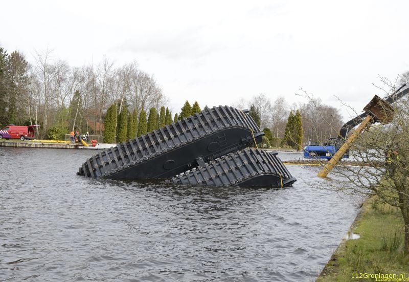 Haren/ Eelde - In het Paterswoldsemeer aan de kant van Eelde(Oude Badweg) is woensdagmorgen een graafmachine omgevallen. De kraan kantelde volledig. De oorzaak is nog onduidelijk.