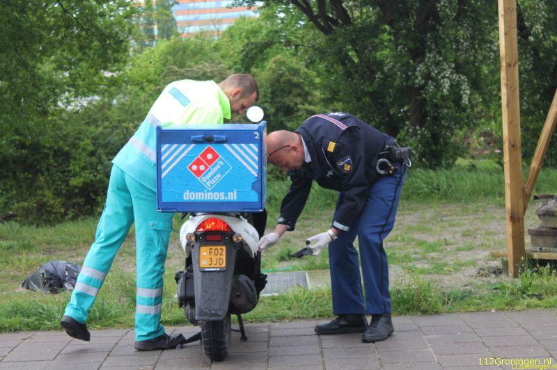 Ter plaatse was er een koerier van Dominopizza met zijn scooter onderuit gegaan . Er kwam een ambulance ter plaatse omdat hij hard was gevallen .
