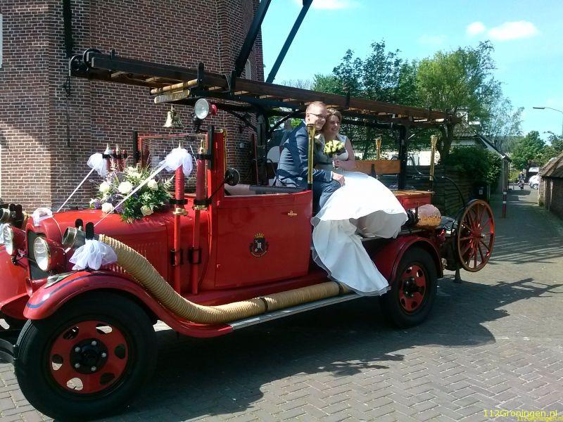 Nou zeg maar op een huwelijks brandweerauto, met Froulien Tilstra. Chris en Froulien werden op de oude A-Ford oldtimer brandweerauto van de Bedumer brandweer naar het gemeentehuis in Bedum gereden, Chris zijn vader die ook brandweerman is in Bedum was hun chauffeur. Tijdens de plechtigheid in de raadzaal van het Gemeentehuis werd eerst een geweldig verhaal verteld door de buitengewoon ambtenaar van de burgelijke stand van de gemeente Bedum.