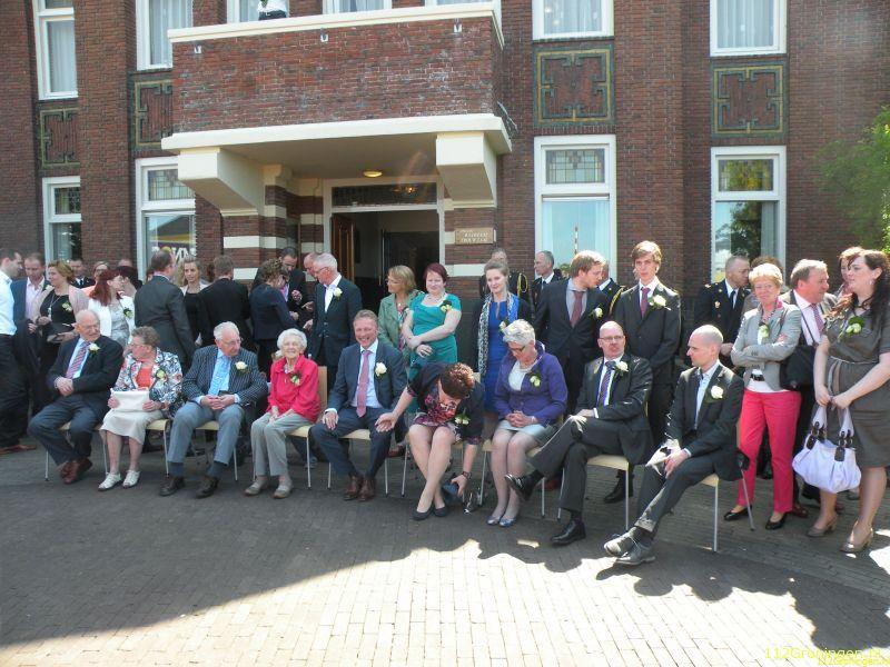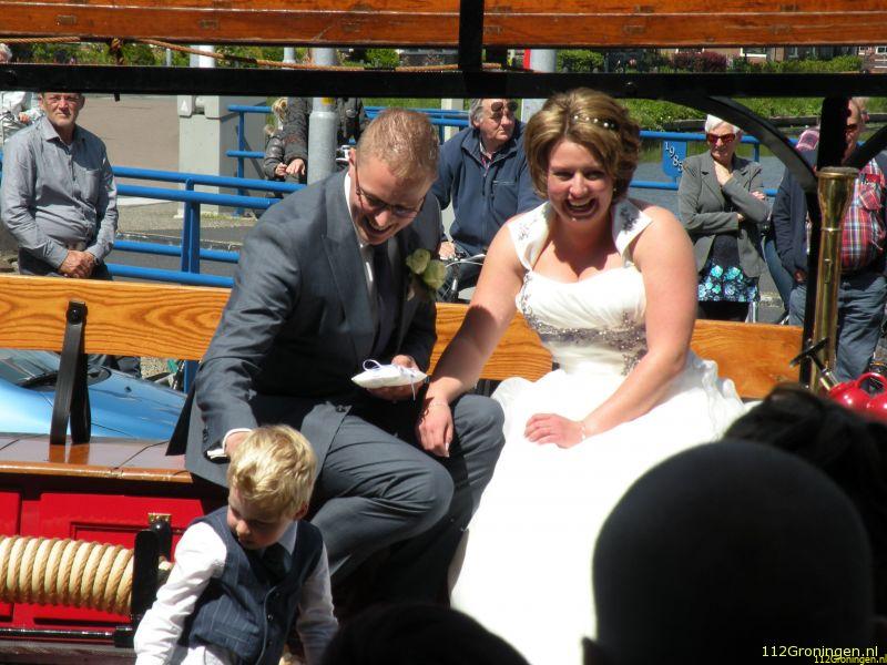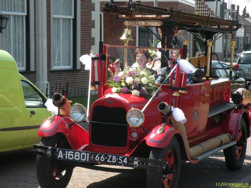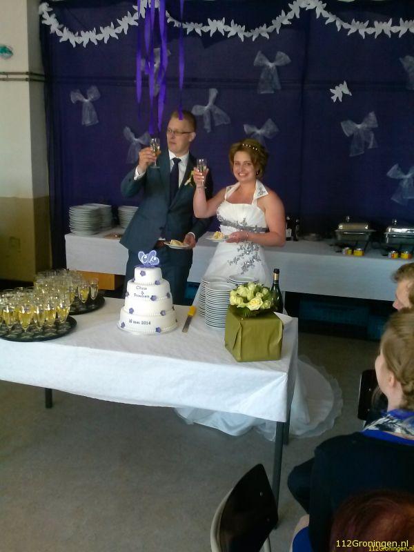 Beneden stonden vele mensen te wachten en natuurlijk het gehele brandweerkorps van Bedum, compleet in “pakje deftig”, om getuige te zijn van deze toch unieke huwelijks voltrekking, alle directe familieleden konden rond het bruidspaar op stoelen zitten. De ambtenaar zij daarop de bekende woorden neemt u……. enz. De ringen werden door een kindje van vrienden op een kussentje aangeboden. Nadat het stel getrouwd was en het gemeentehuis was verlaten werd op een locatie in Bedum de bruidstaart aangesneden, en `savonds was er een bruiloft in de Postwagen in Tolbert.