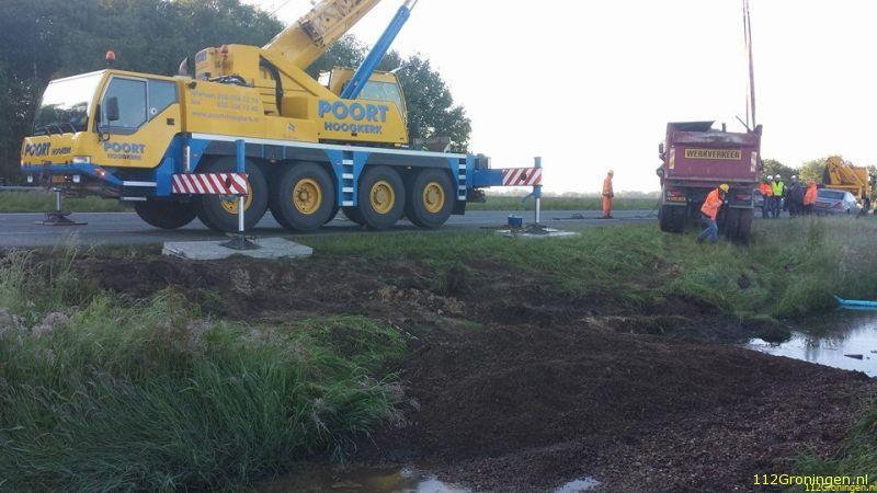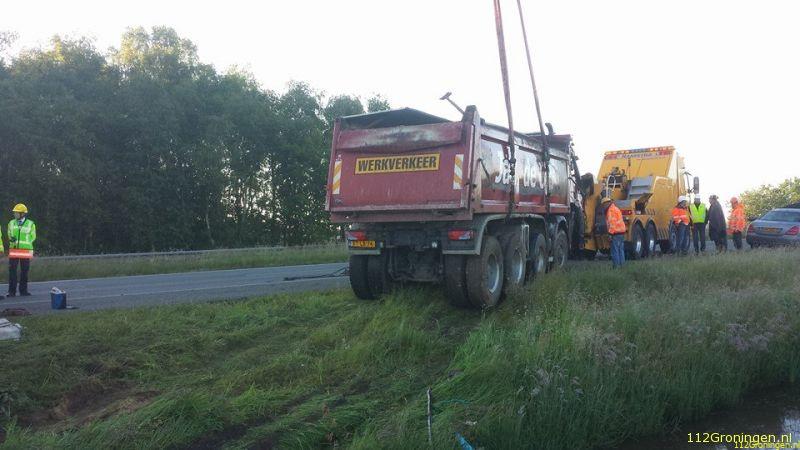 Vries - Vrijdagnacht is er op de A28 een vrachtwagen geladen met grint in de sloot beland .