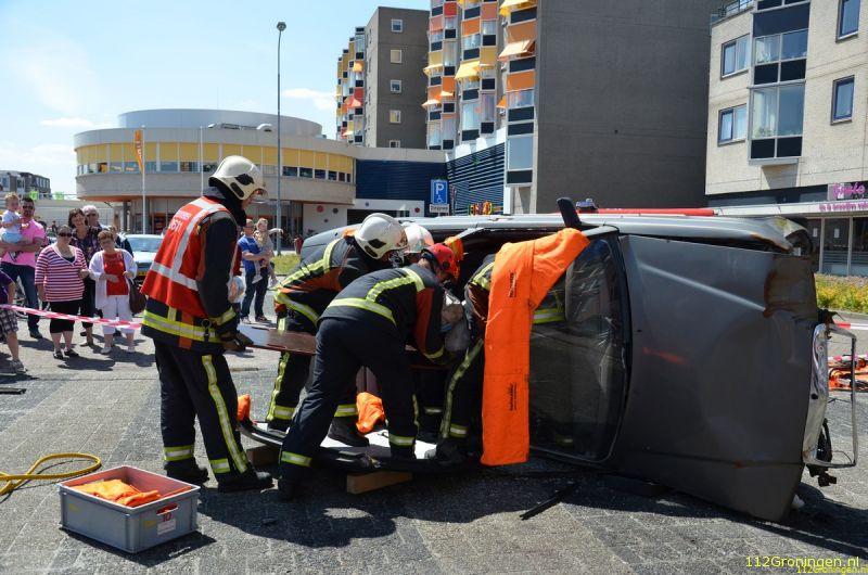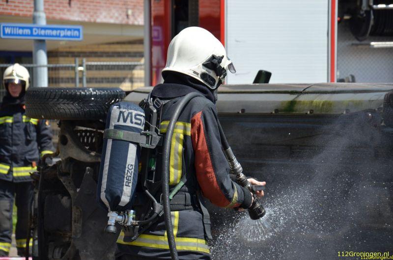Onderweg kreeg men te horen dat er nog iemand in het voertuig zou zitten. Ter plaatse trof de brandweer een gekantelde auto aan waar inderdaad nog een persoon in zat. Onder de motorkap kwam wat rook weg. De brand is snel geblust waarna men kon beginnen met het bevrijden van het slachtoffer. Gelukkig betrof het hier allemaal een demonstratie van de brandweer Stadskanaal.