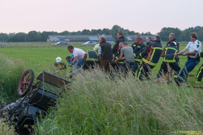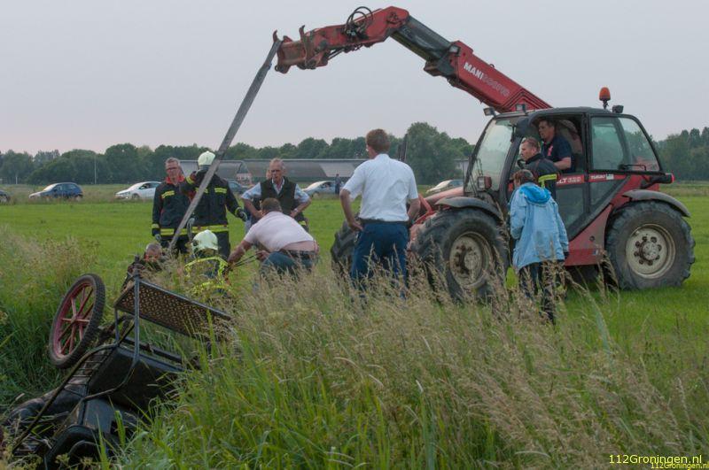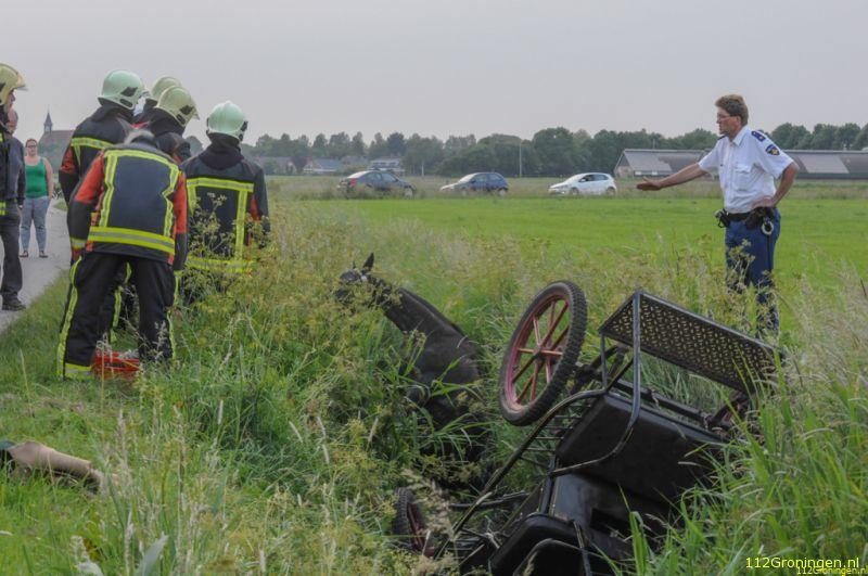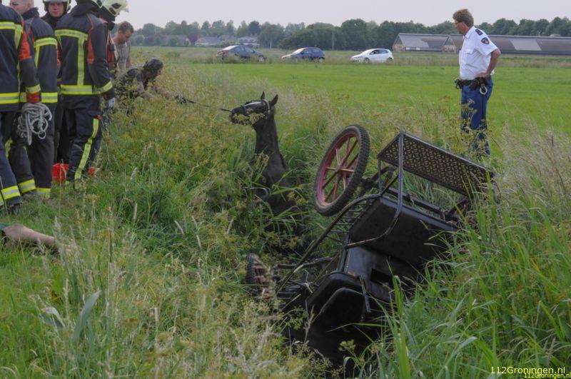 Een vrouw dat ook op de wagen zat bleef ongedeerd en kwam er van af met enkel een nat pak. Brandweerlieden en omstanders slaagden erin na diverse pogingen in het paard dat vast kwam te zitten in de sloot op het droge te krijgen.