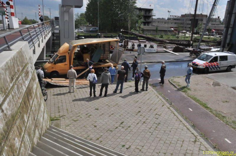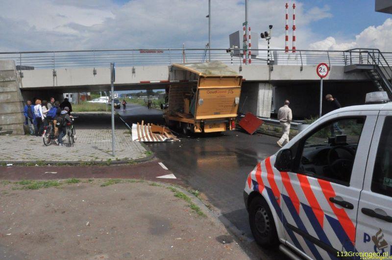 Groningen - Om 14:50 uur is een auto van kringloopwinkel Goud Goed tegen het viaduct onder de Eltjo Ruggeweg gereden. Het was toen goed FOUT.