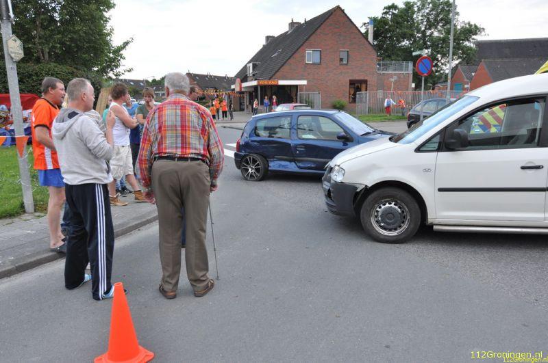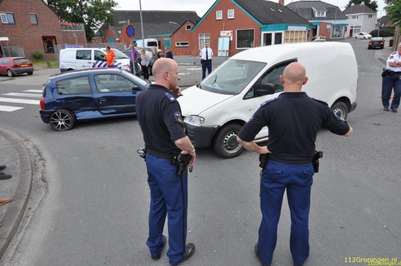 Twee voertuigen zijn na een voorrangsfout (van vermoedelijk de bestuurder van de blauwe auto) met elkaar in botsing gekomen. Ambulancepersoneel heeft een slachtoffer nagekeken, maar dat bleek gelukkig mee te vallen. De voertuigen moesten worden afgesleept door een berger.