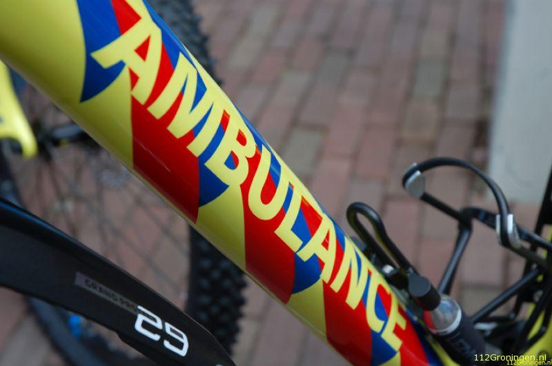 De nieuwe ambulancefietsen zijn speciaal voor het UMCG-team gebouwd. Samen met fietsspecialist Klaas Almoes van Egbert Egberts en spuiter Martijn Groenewold uit Borger heeft het team stoer maatwerk gerealiseerd. Van licht en wendbaar en toch heel erg stevig tot aan der4tig versnellingen en fietsbanden die zichzelf direct repareren bij een lek, zodat gewoon kan worden doorgefietst, vertelt Elrik Rotman, ambulanceverpleegkundige en al jaren lid van het bike-team. “En ze hebben een opvallend uiterlijk.” De basis is van de nieuwe fietsen is een zeer hoogwaardig ATB-frame. “Met onze eerste fietsen hebben we de afgelopen jaren veel ervaring opgedaan wat handig is en wat niet. Zo hebben we niet alleen technisch perfecte fietsen gekregen, maar hebben we ook de medische uitrusting kunnen perfectioneren. Een fiets met rode en een fiets met blauwe tassen, met ieder een speciale inhoud. Je grijpt dan nooit meer mis.”