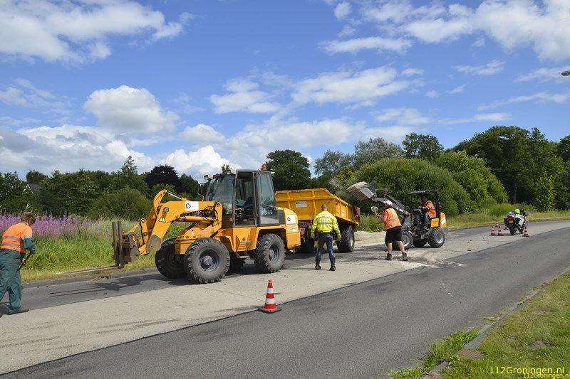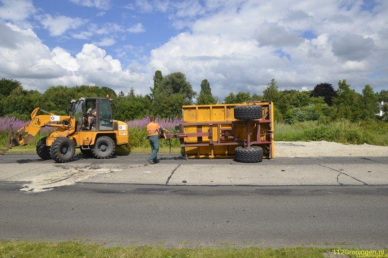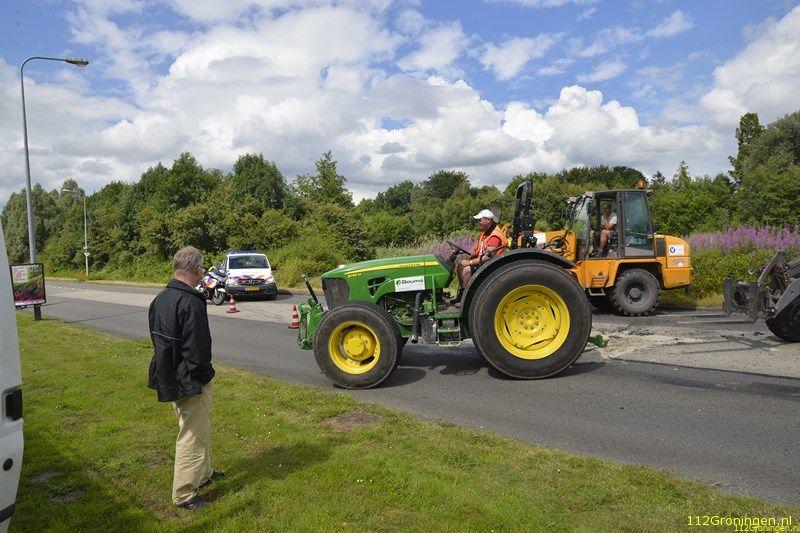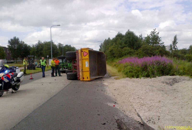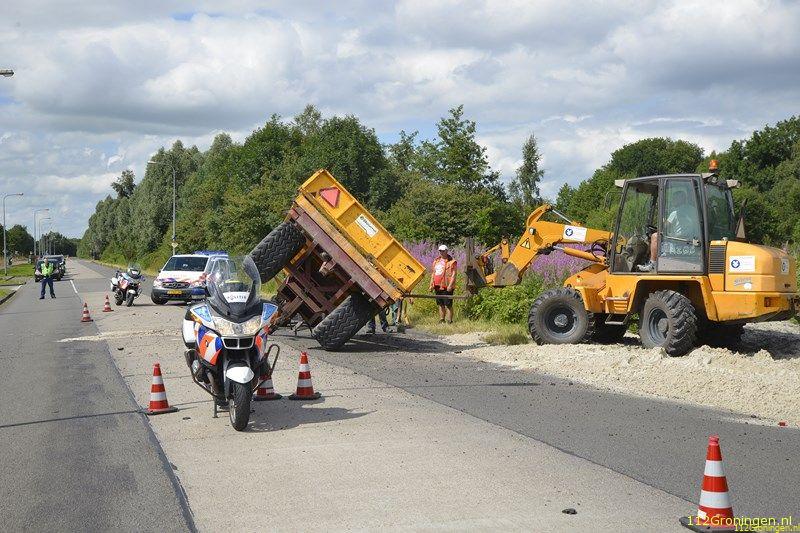 Groningen/ Eelderwolde - Dinsdagmiddag kwam er een melding binnen van een trekker met aanhanger die op de kant was gegaan op de Paterswoldseweg ter hoogte van de Hoornseplas.