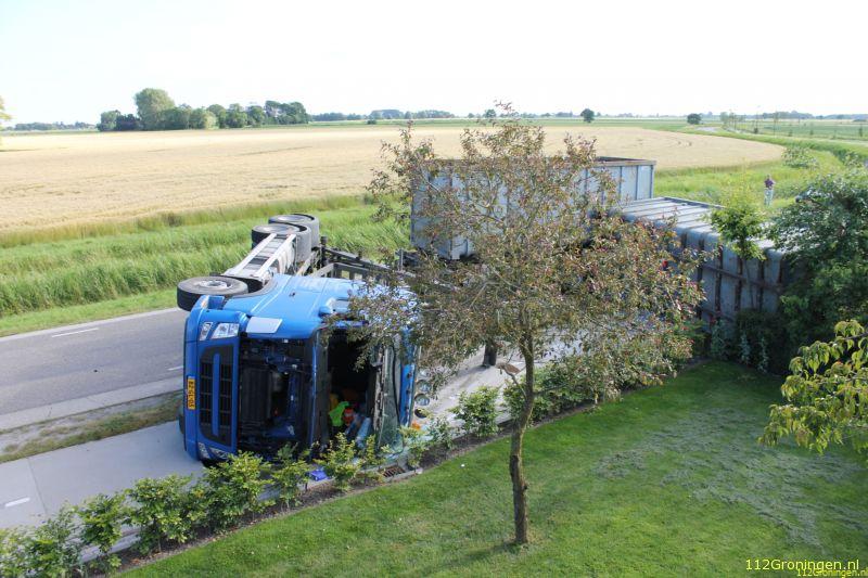 Ook de container kwam op zijn kant terecht waardoor de mest op zowel de rijbaan en het fietspad terecht kwam. De bestuurder moest met gezichtsletsel overgebracht worden naar het Martiniziekenhuis in Groningen. De politie onderzoek de toedracht van het ongeval.