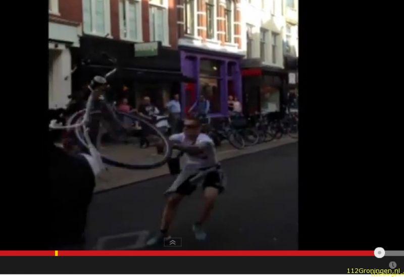 Op beeldmateriaal was te zien dat een man op de Oosterstraat een fiets tegen een muzikant gooide. Deze raakte hierbij gewond.
