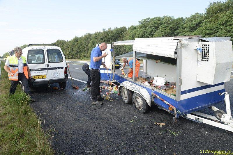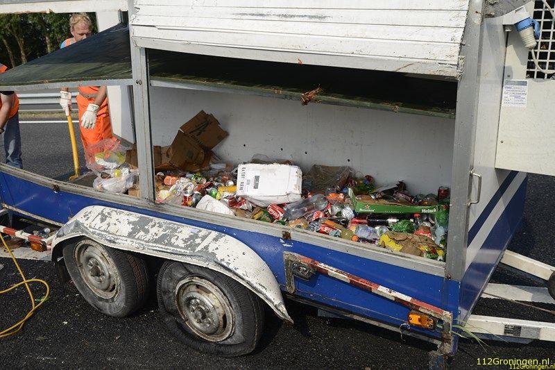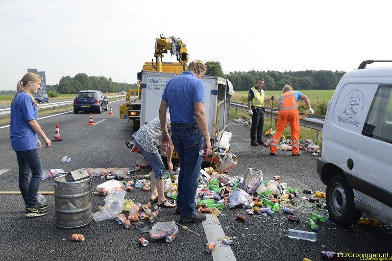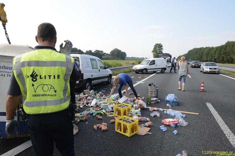 Ter plaatse was een aanhanger van een van een cateringbedrijf over de kop geslagen en een grote hoeveelheid flessen en blikken drank lagen over de weg verspreid.