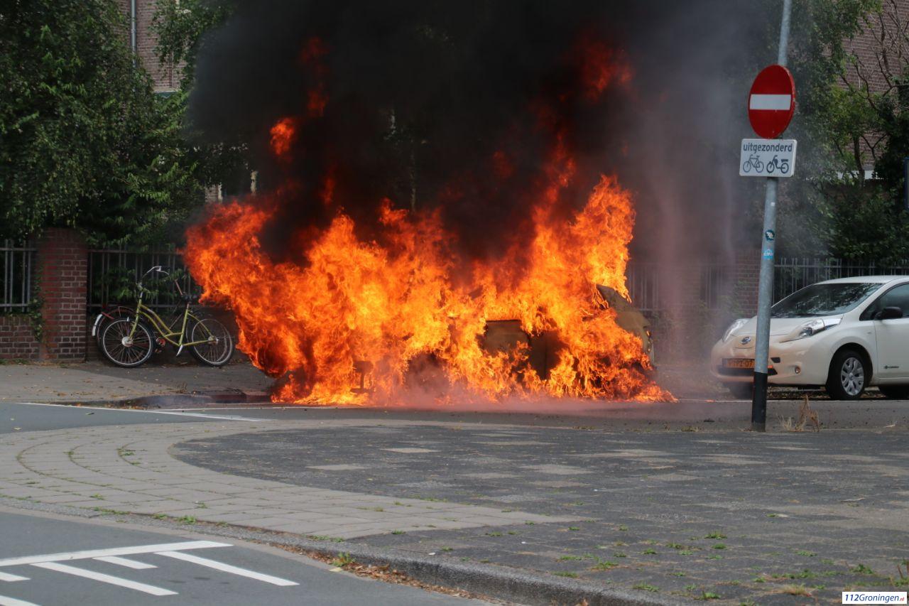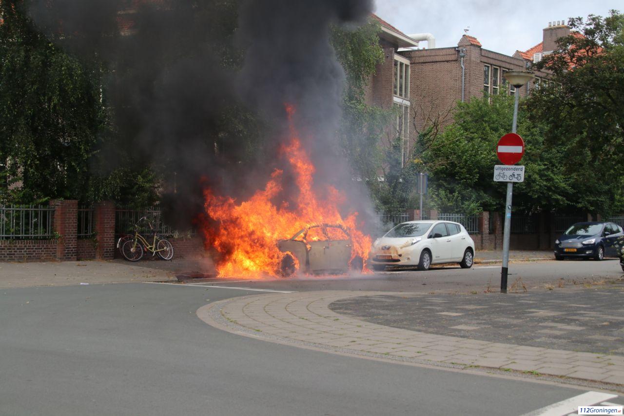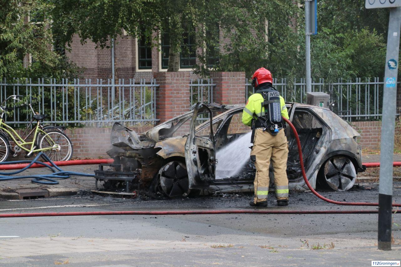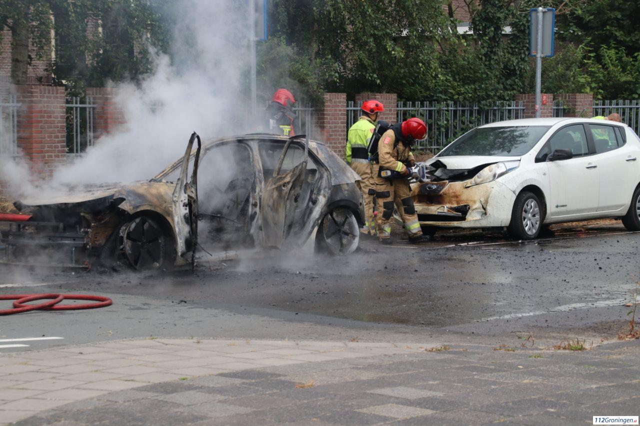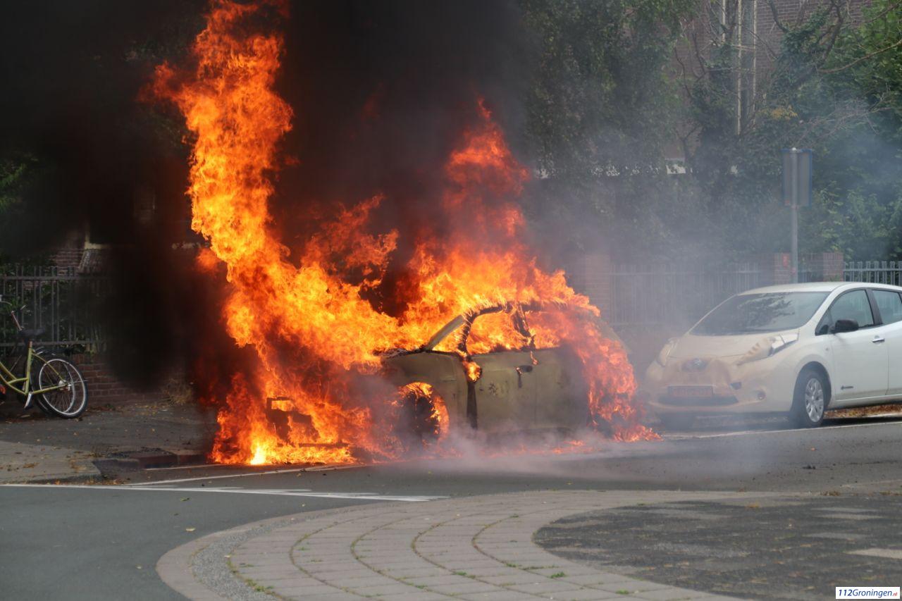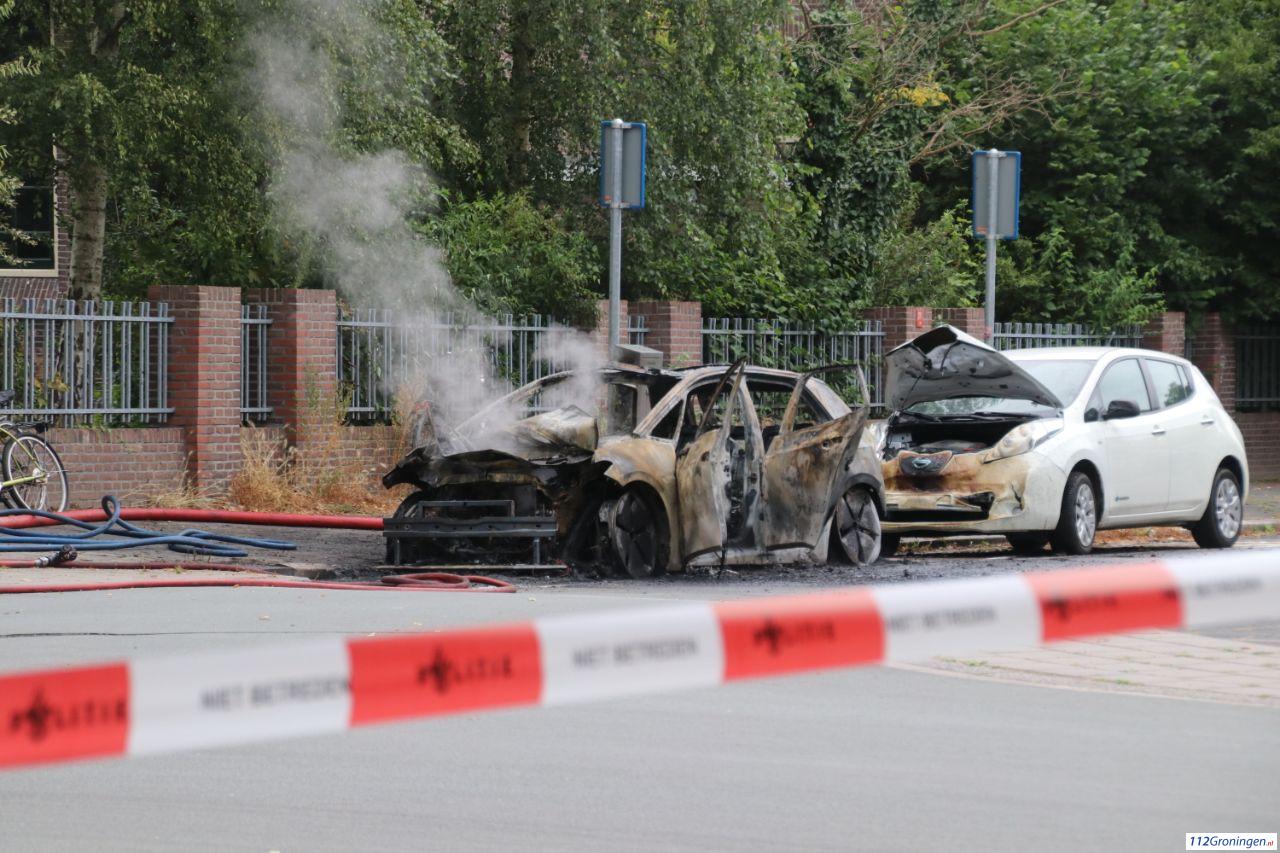 Een elektrische personenauto is zaterdagochtend volledig uitgebrand aan de Coendersweg in Helpman-Oost in Groningen.
