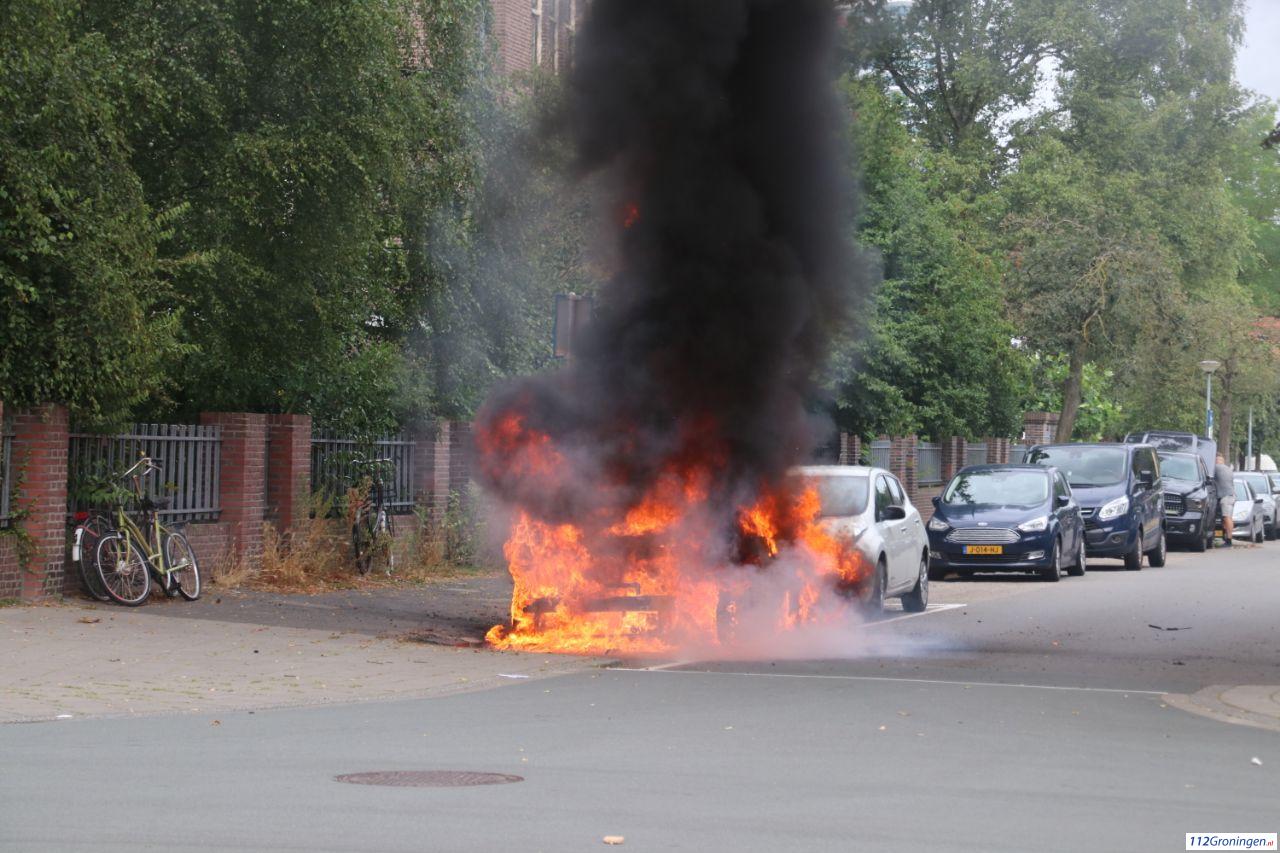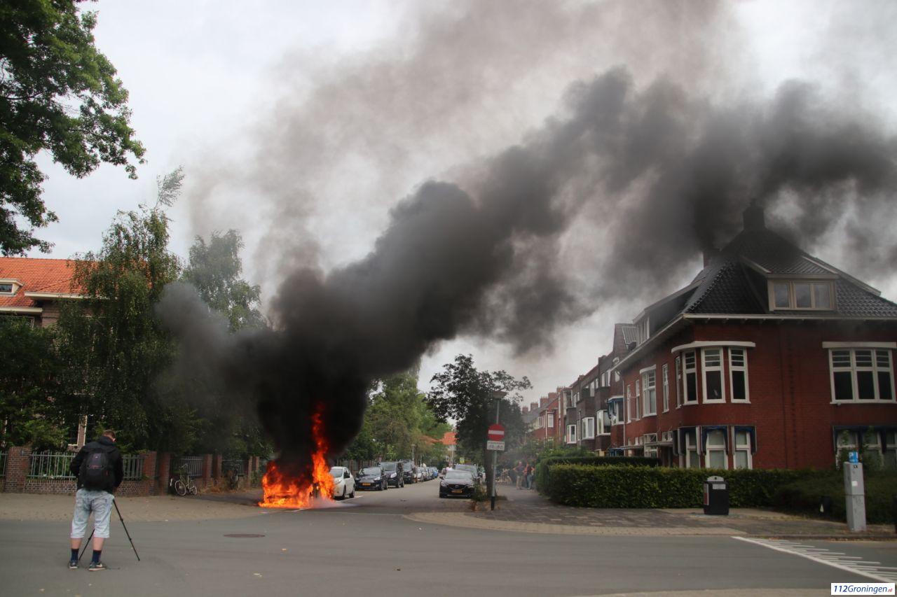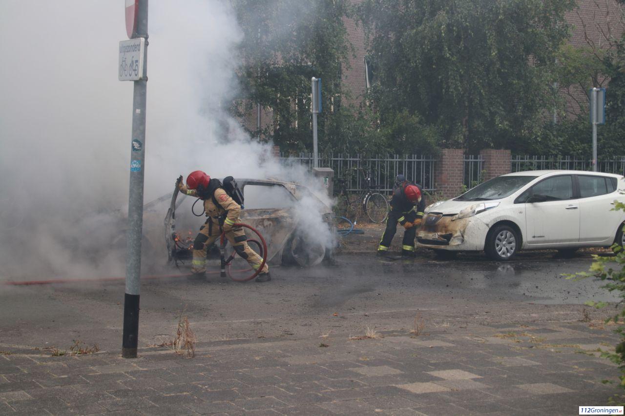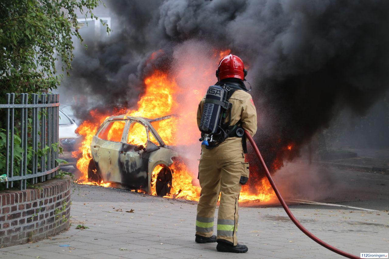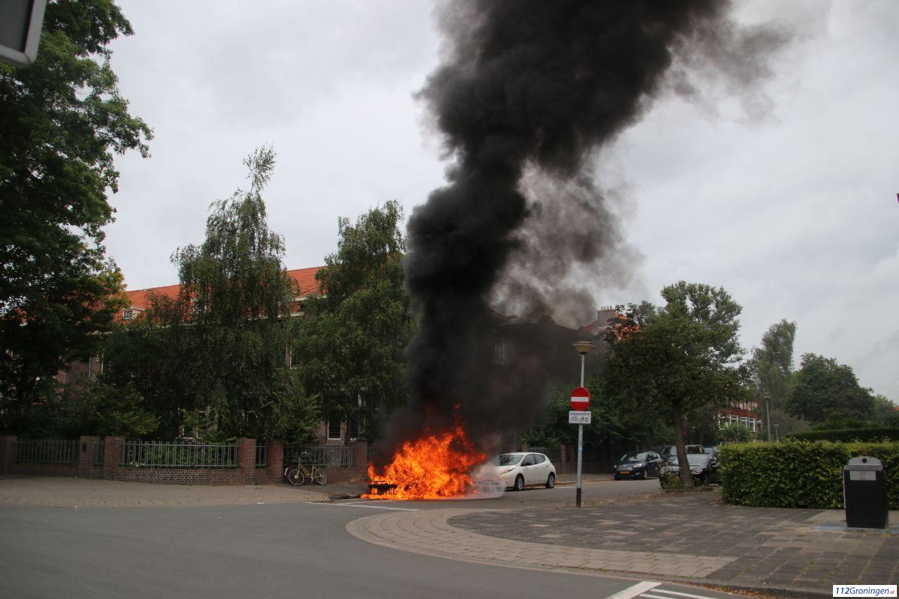 Een elektrische personenauto is zaterdagochtend volledig uitgebrand aan de Coendersweg in Helpman-Oost in Groningen.