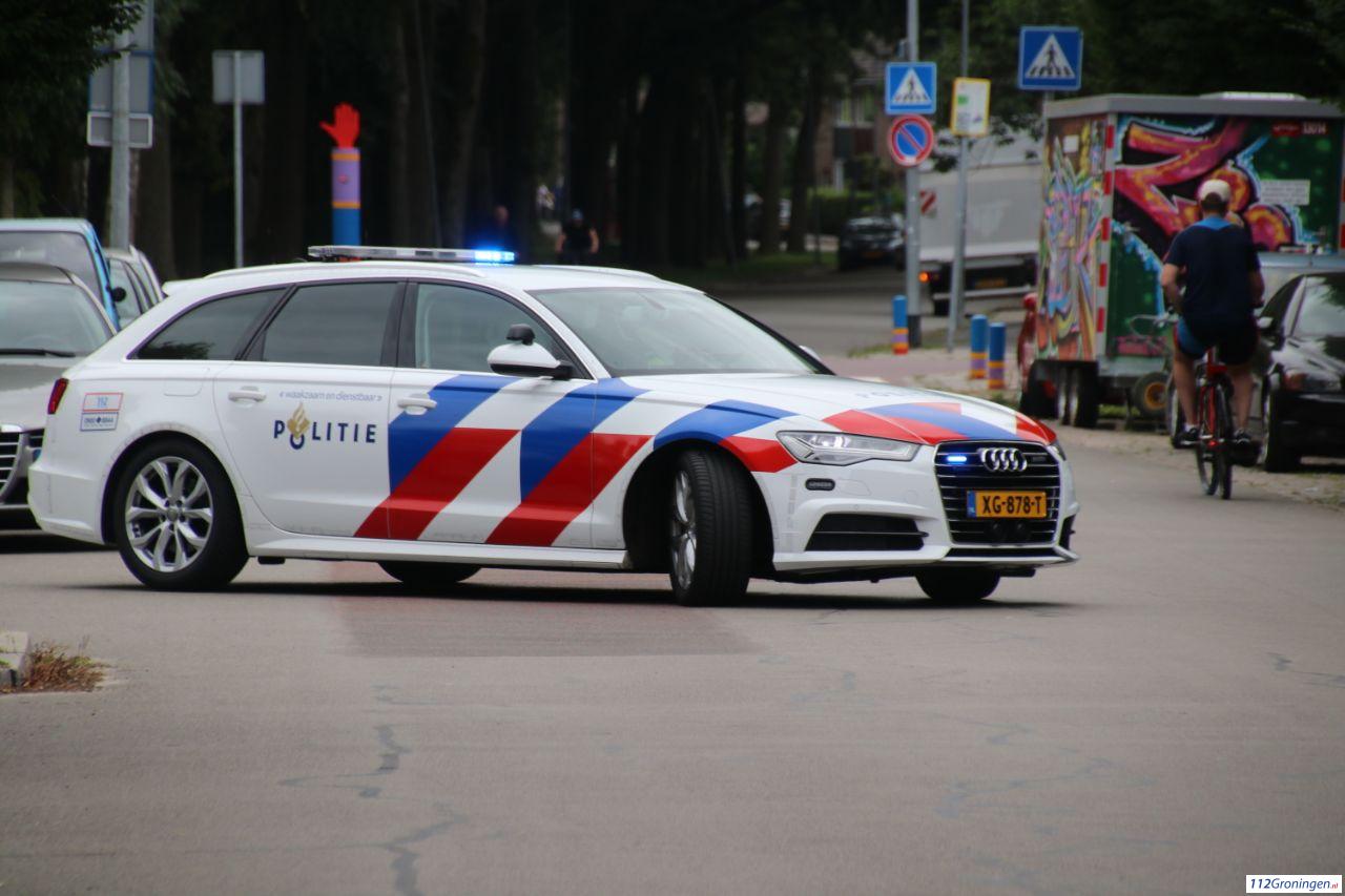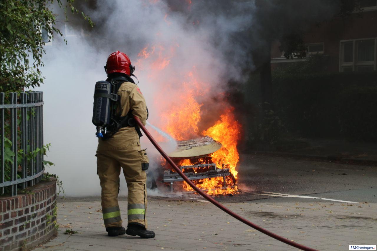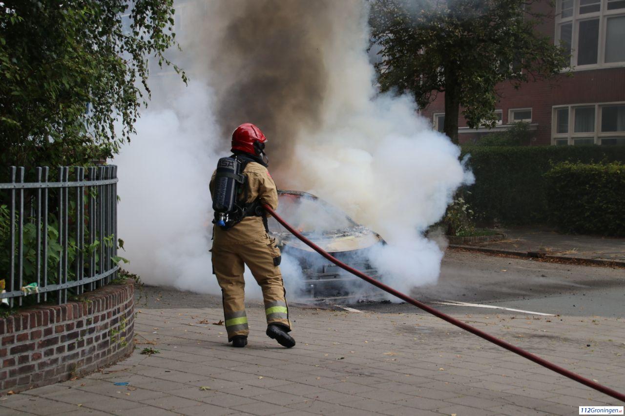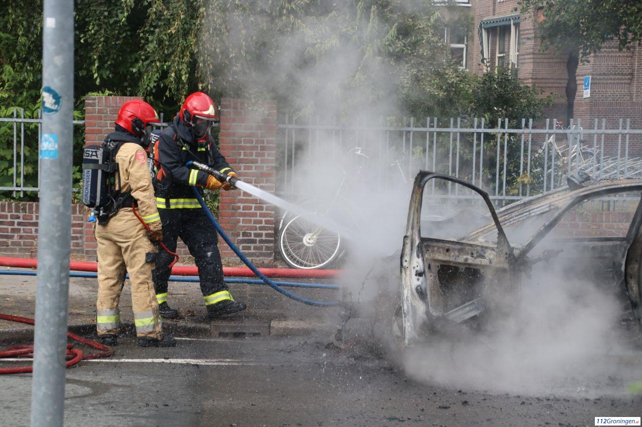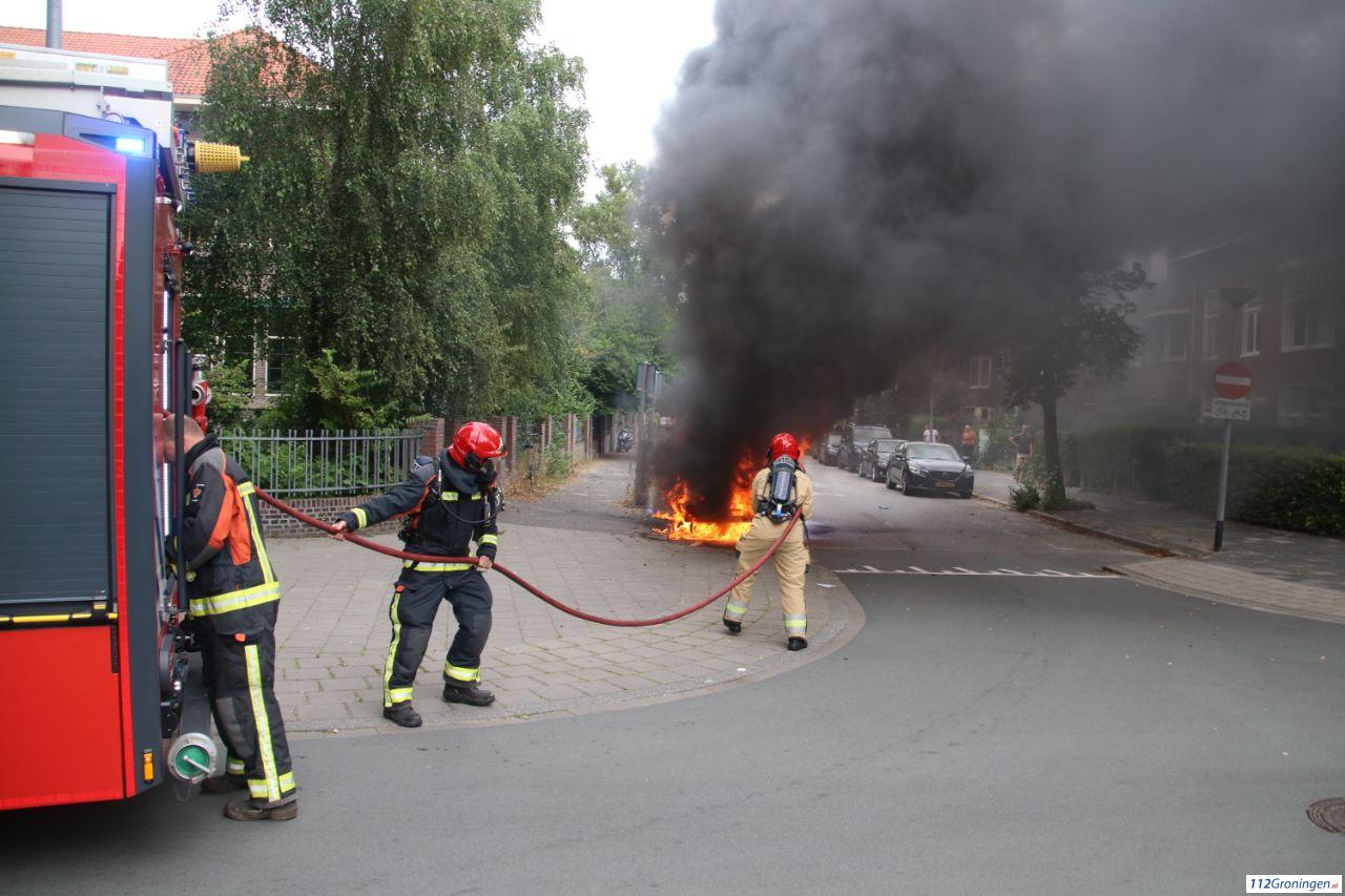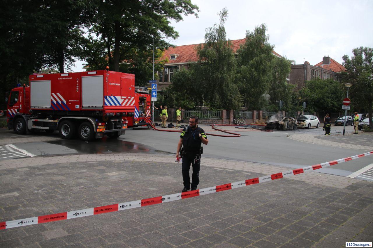 Een elektrische personenauto is zaterdagochtend volledig uitgebrand aan de Coendersweg in Helpman-Oost in Groningen.