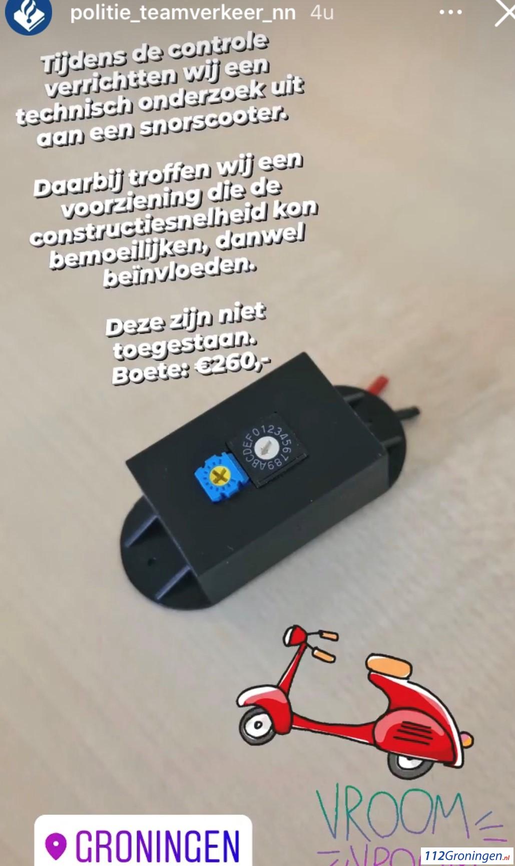 Groningen – Tijdens een controle vrijdagmiddag in Groningen bij een snorscooter trof Team Verkeer van de politie een apparaatje aan nadat men een technisch onderzoekje instelde. Daarmee kan je de constructiesnelheid van de scooter bemoeilijken maar ook beïnvloeden schrijven ze. Dat apparaatje is illegaal zegt de politie via Instagram. De boete is dan ook 260 euro. Ook werd het deel dat verboden is verwijderd.
