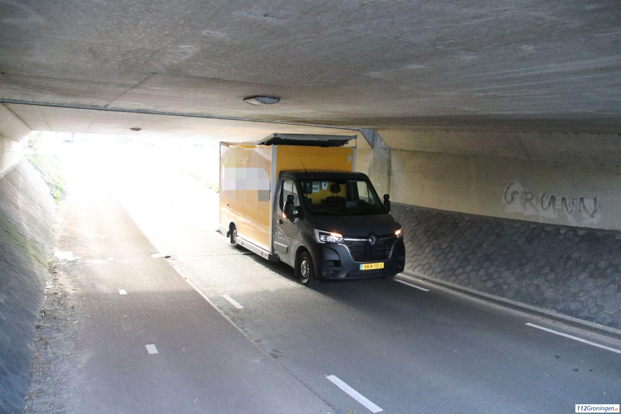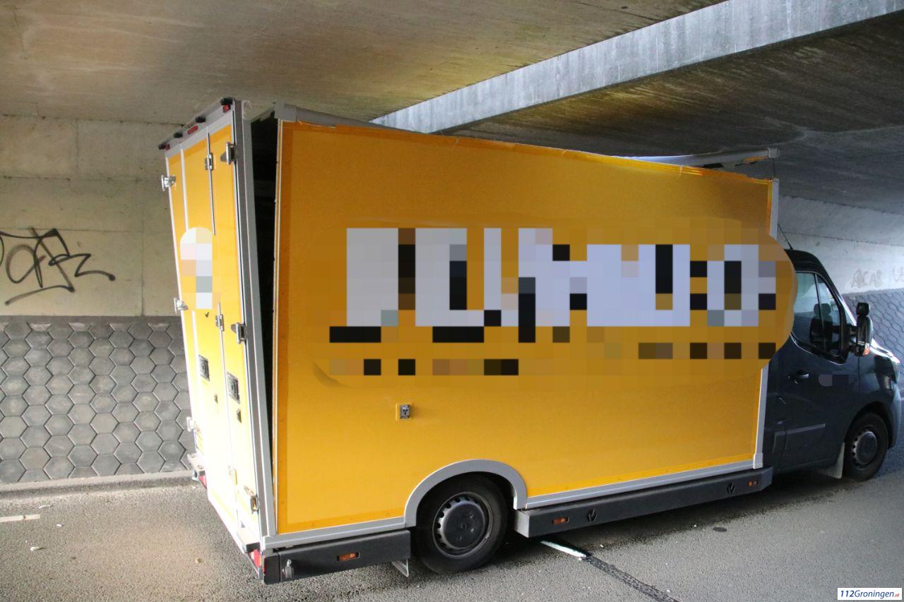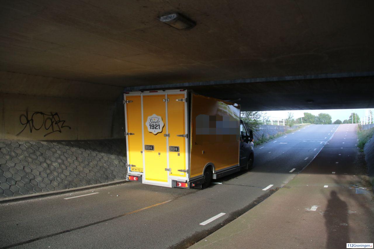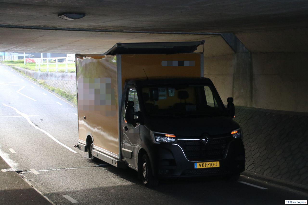 Groningen – Een bestelwagen van een supermarktketen is zaterdagmiddag vast komen te zitten onder het viaduct aan de Olgerweg in de stad Groningen.