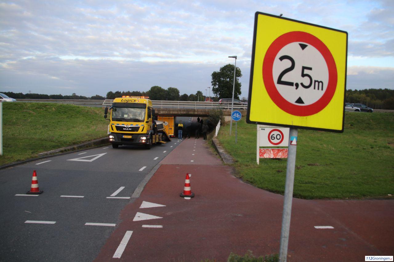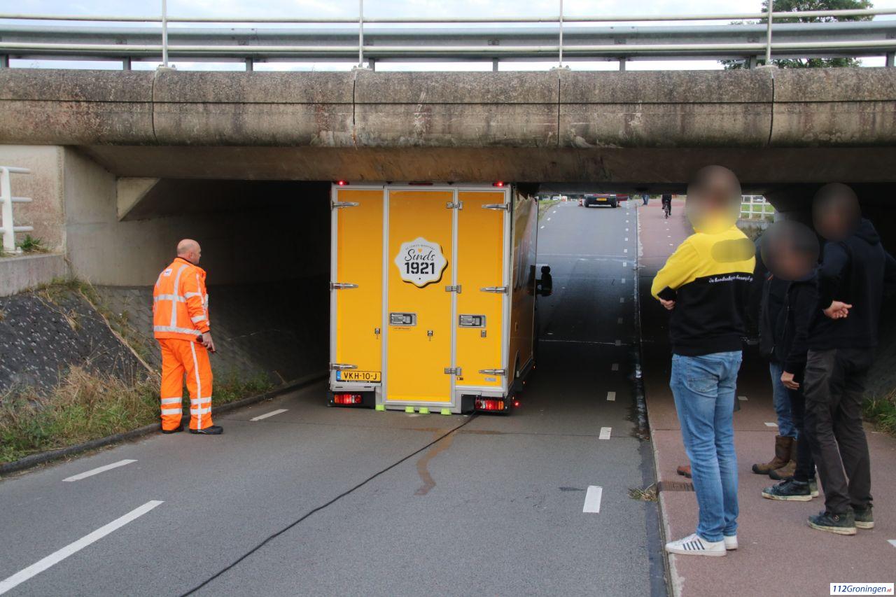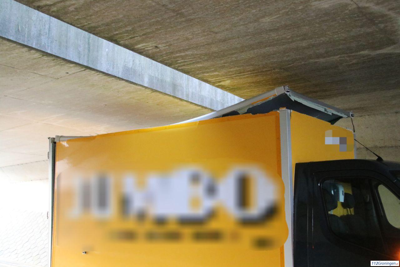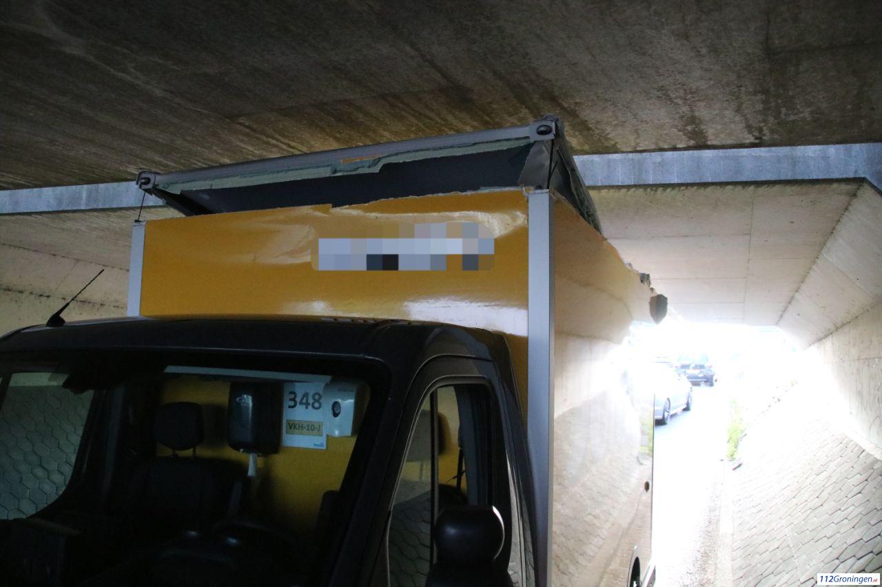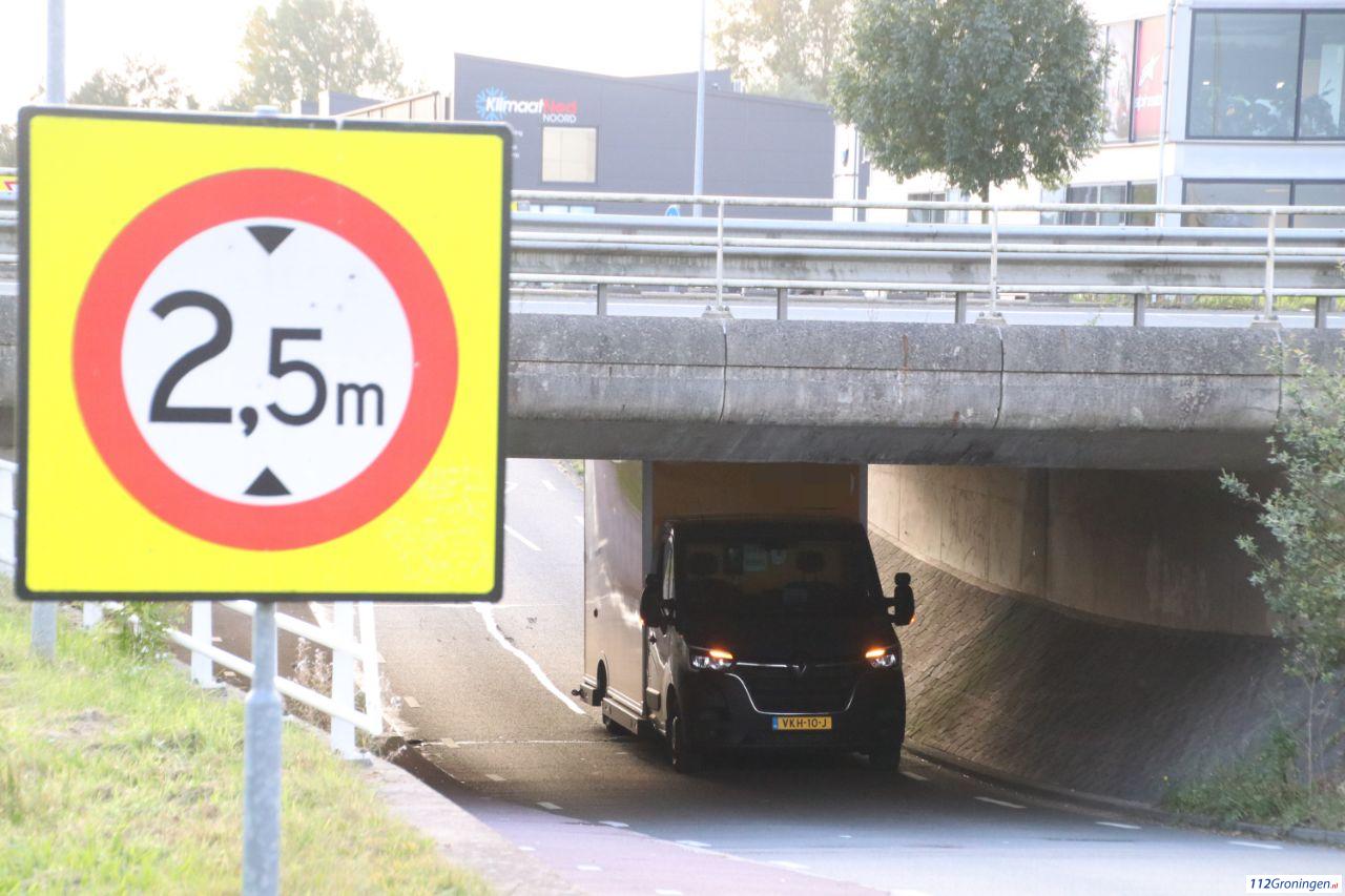 Groningen – Een bestelwagen van een supermarktketen is zaterdagmiddag vast komen te zitten onder het viaduct aan de Olgerweg in de stad Groningen.