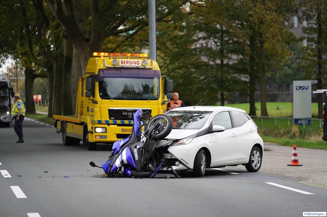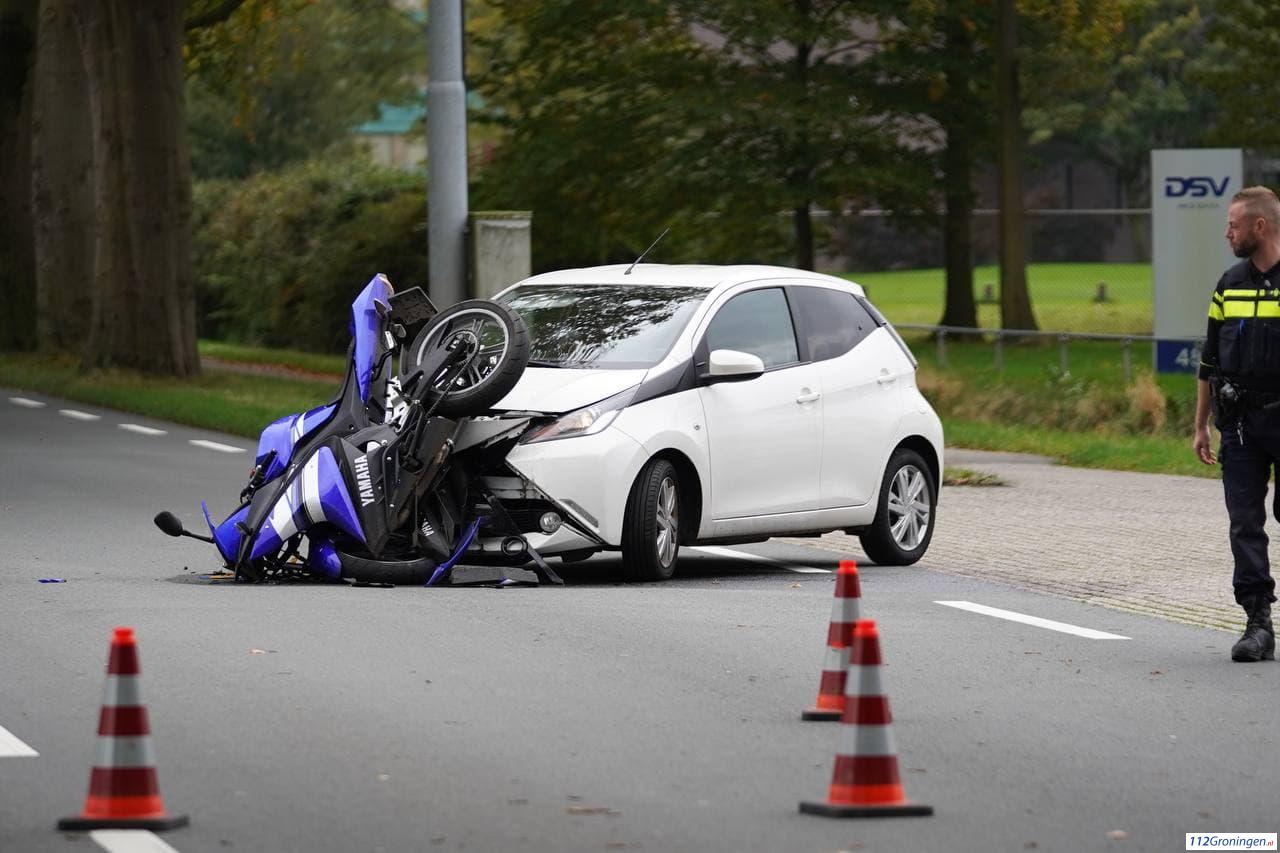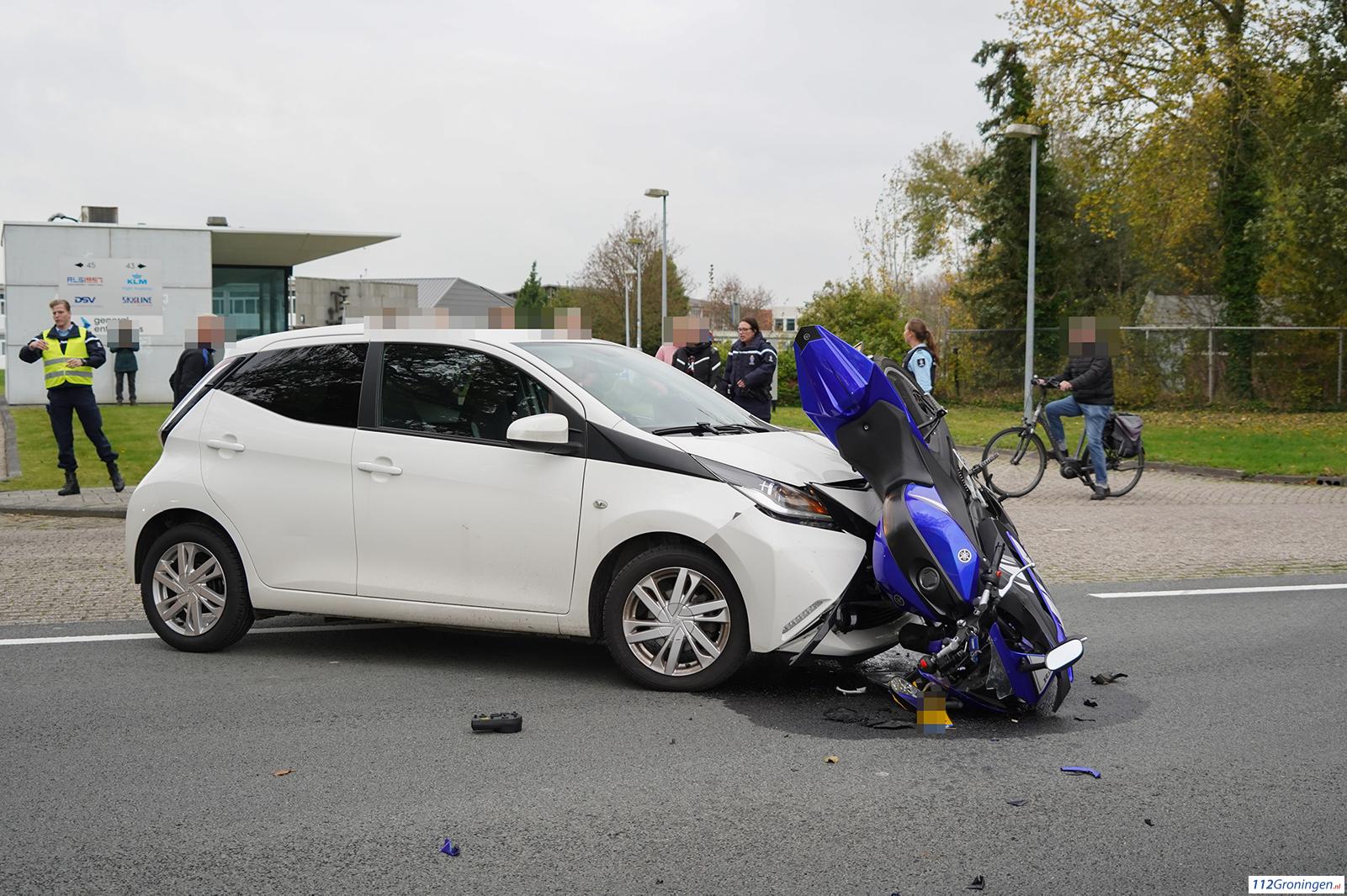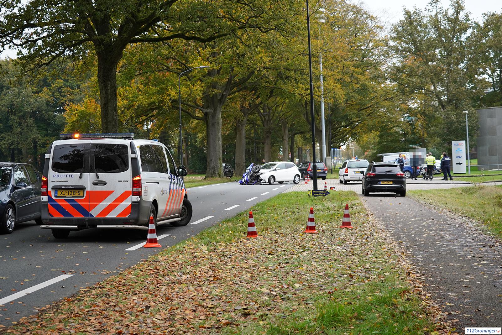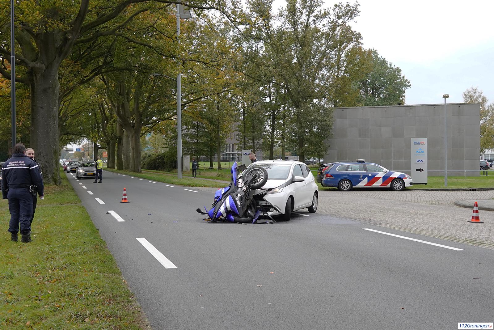 Eelde – Dinsdagmiddag heeft er een flinke aanrijding plaatsgevonden tussen een motor en een auto aan de Burgemeester J.G. Legroweg ter hoogte van de ingang van de KLM fly academy.