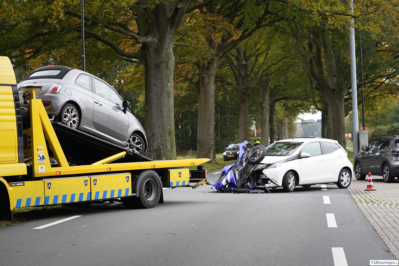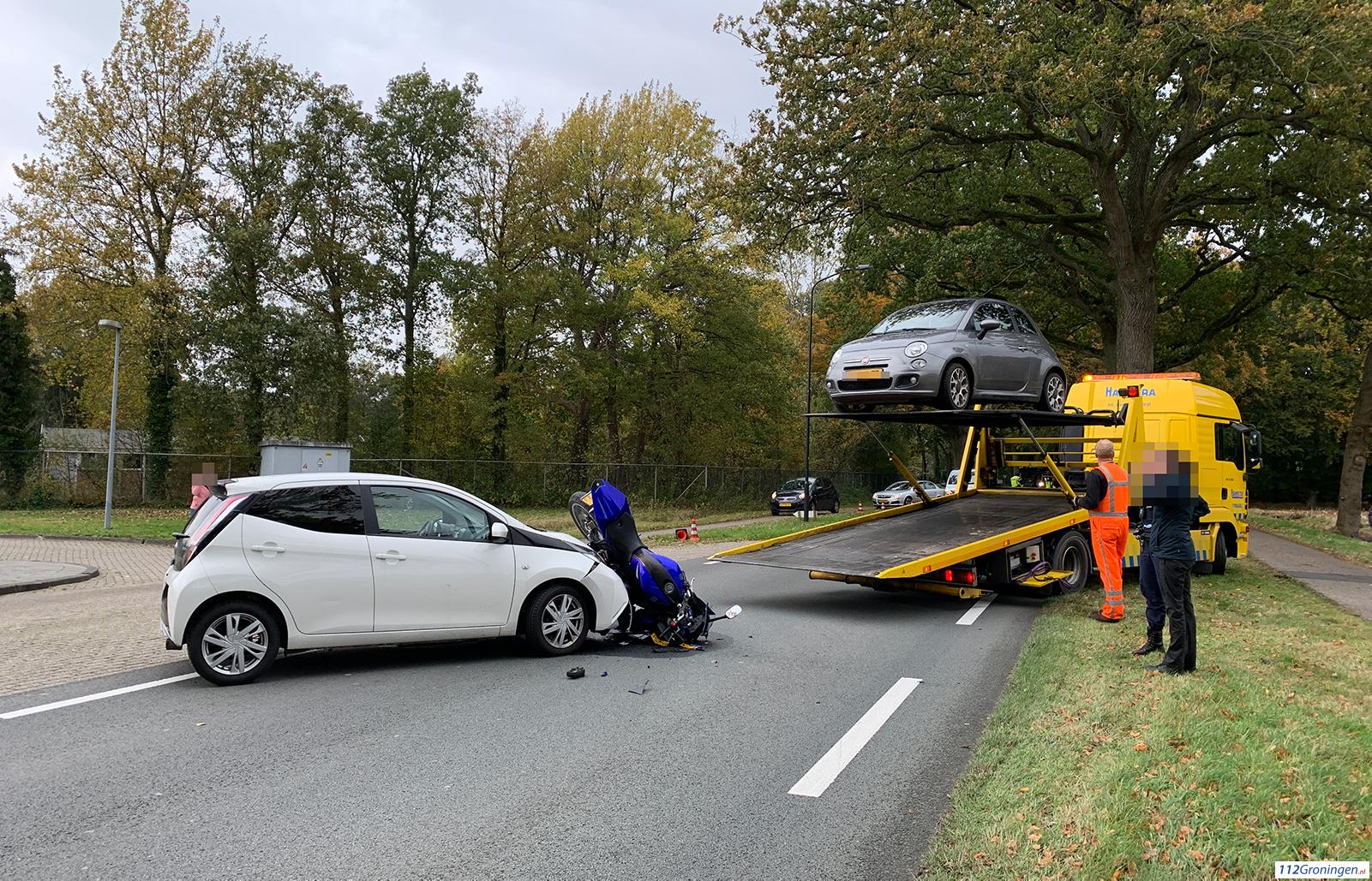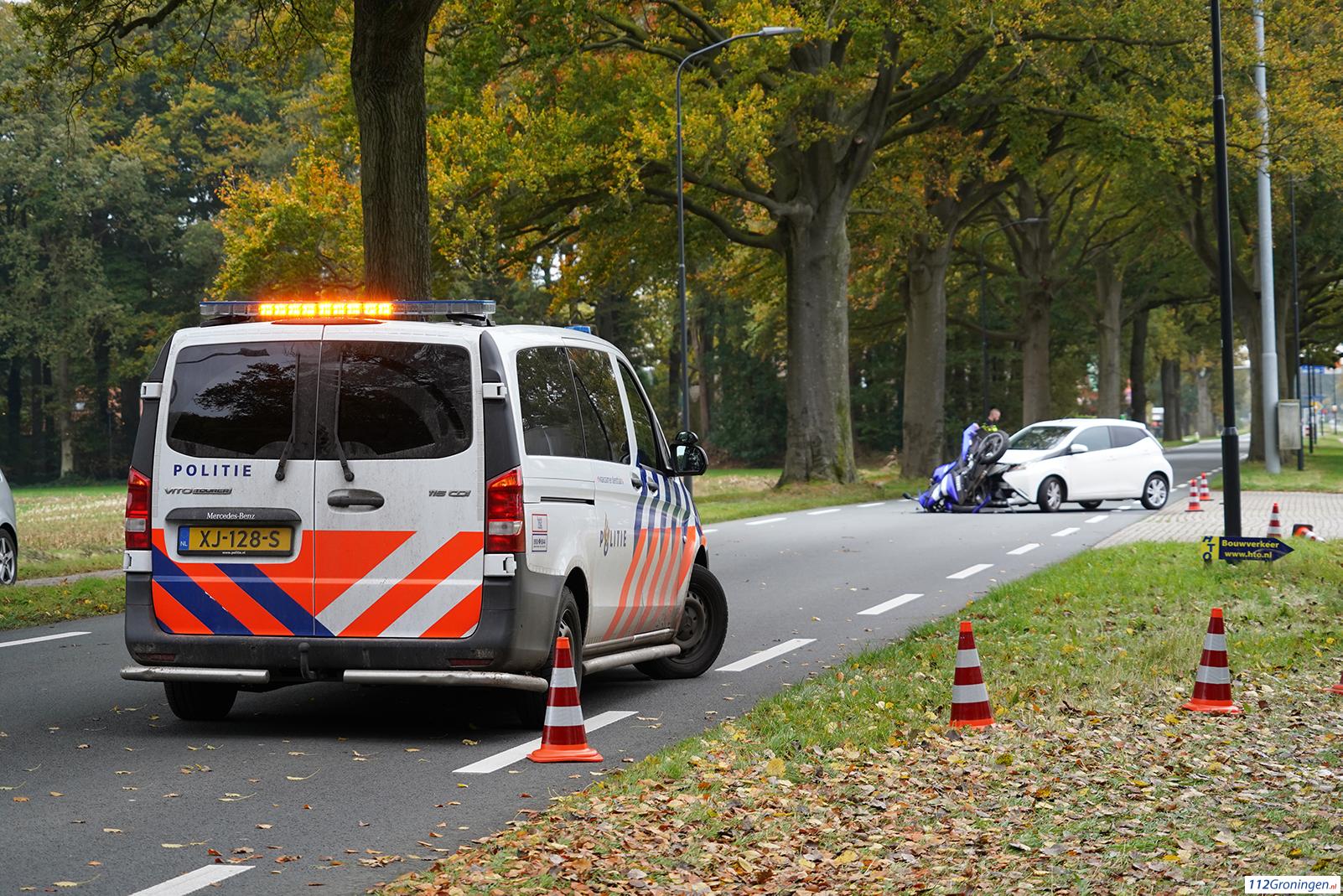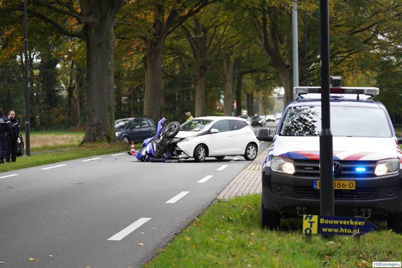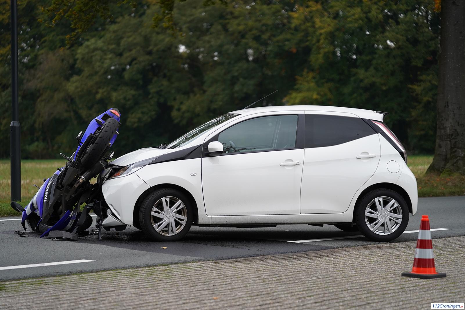 Eelde – Dinsdagmiddag heeft er een flinke aanrijding plaatsgevonden tussen een motor en een auto aan de Burgemeester J.G. Legroweg ter hoogte van de ingang van de KLM fly academy.
