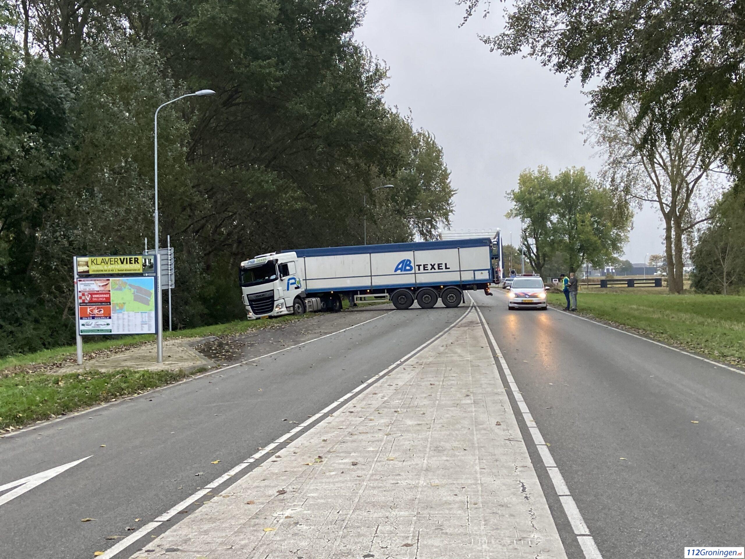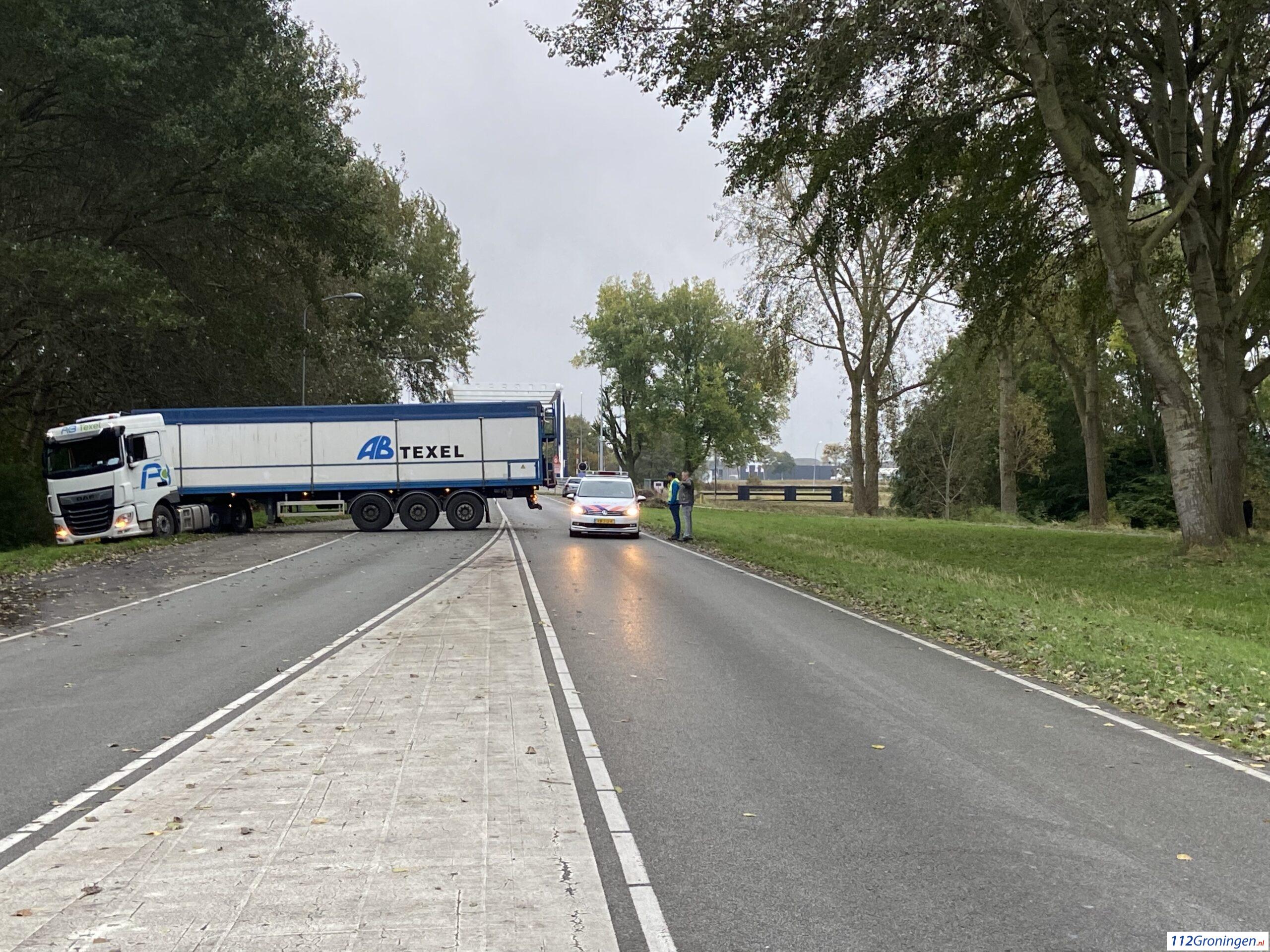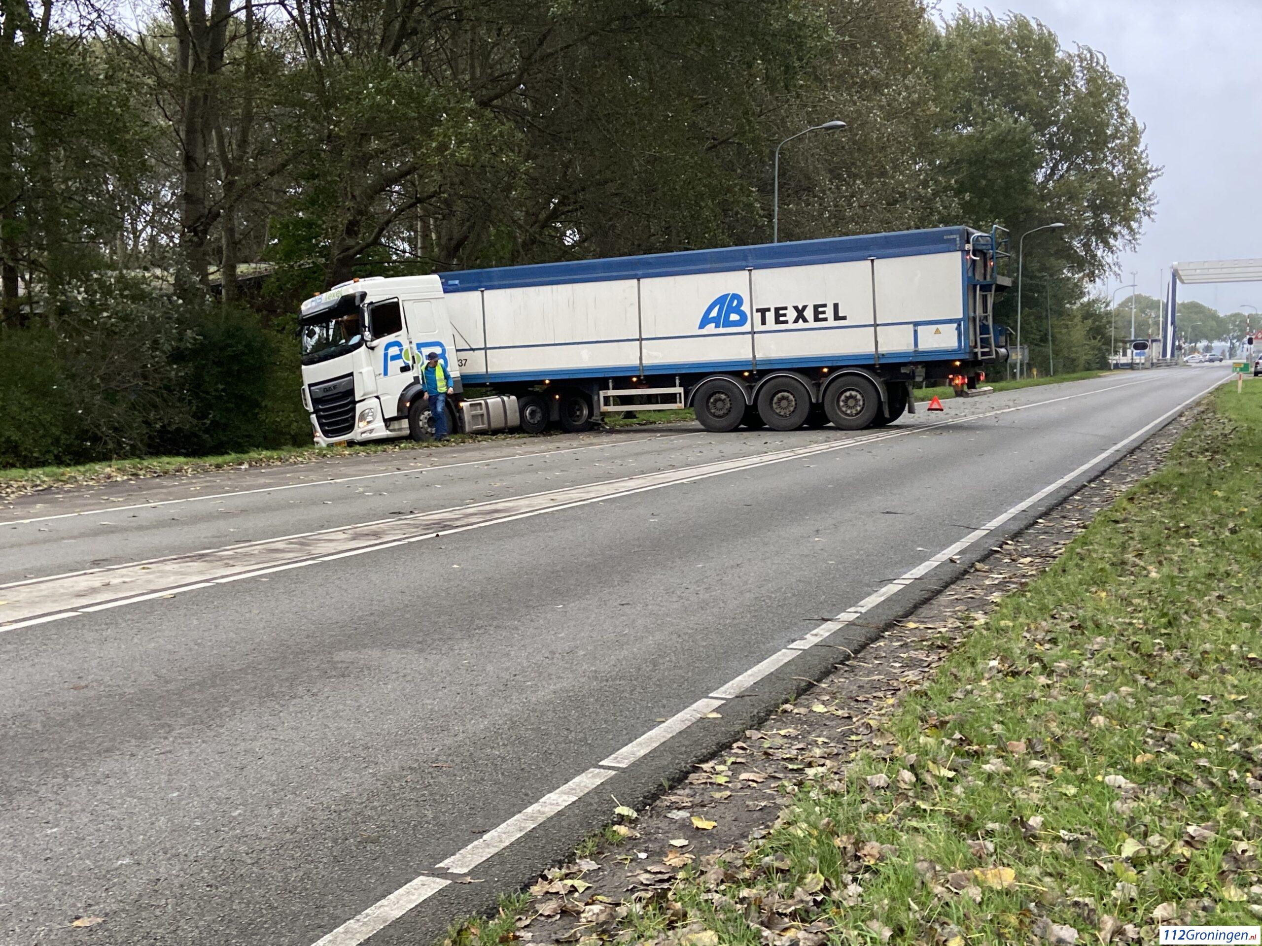 Delfzijl – Op de Oosterveldweg in Delfzijl is dinsdagmiddag rond 17:00 uur een vrachtwagen geschaard. Vermoedelijk was de chauffeur van plan om te keren op de weg, dat ging niet helemaal goed met de zachte berm.