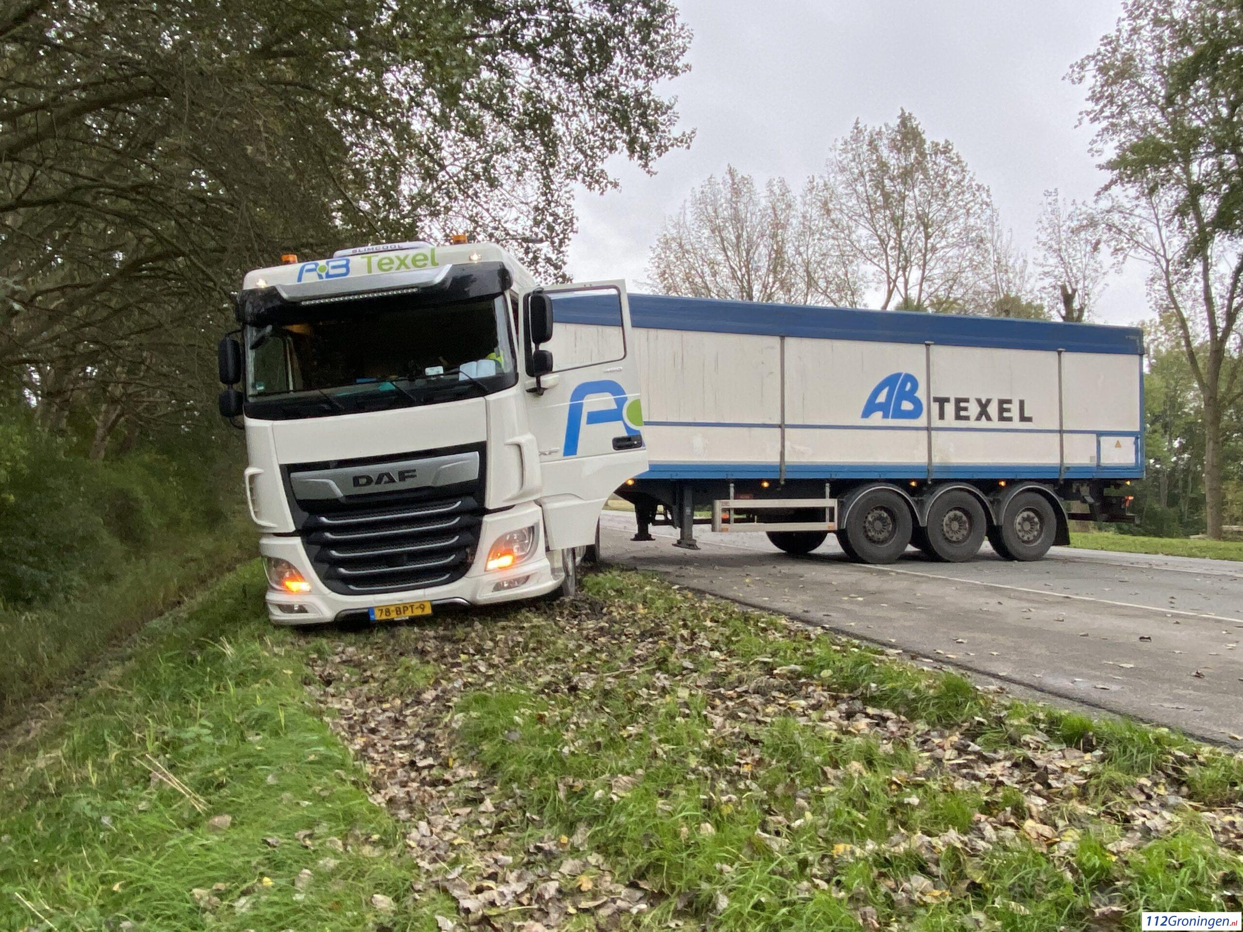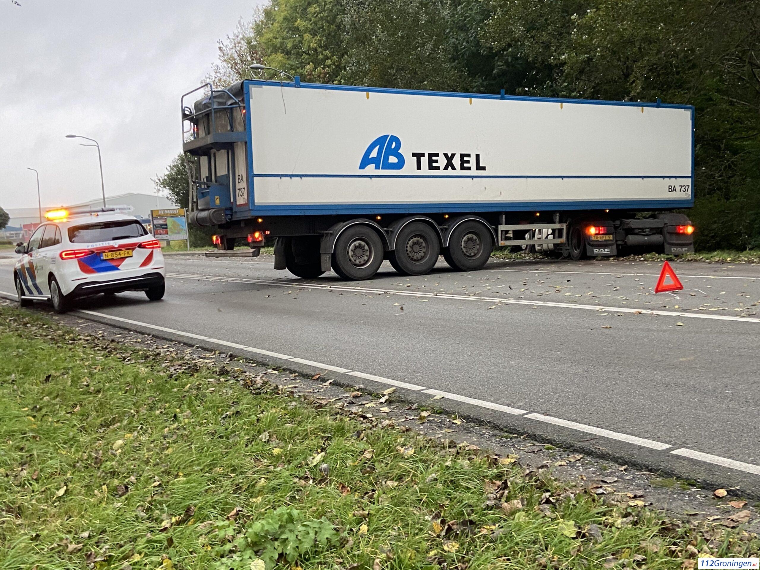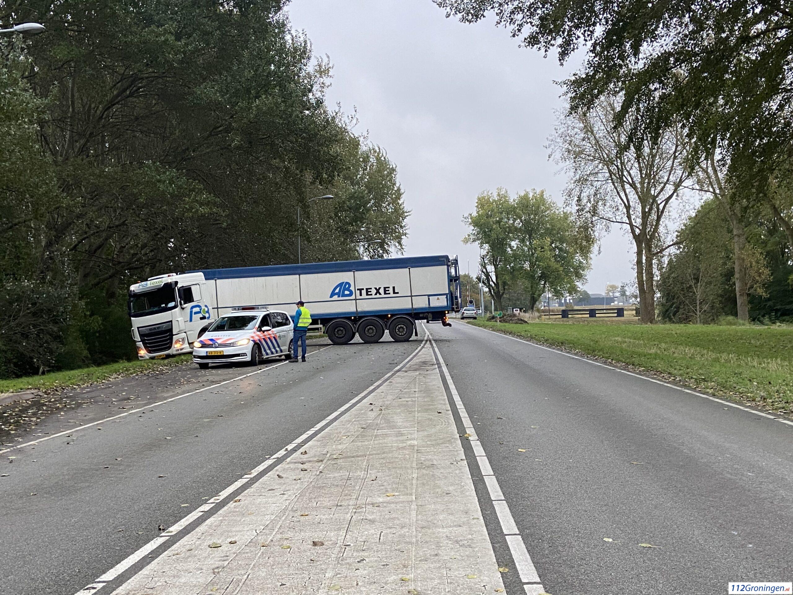 Delfzijl – Op de Oosterveldweg in Delfzijl is dinsdagmiddag rond 17:00 uur een vrachtwagen geschaard. Vermoedelijk was de chauffeur van plan om te keren op de weg, dat ging niet helemaal goed met de zachte berm.