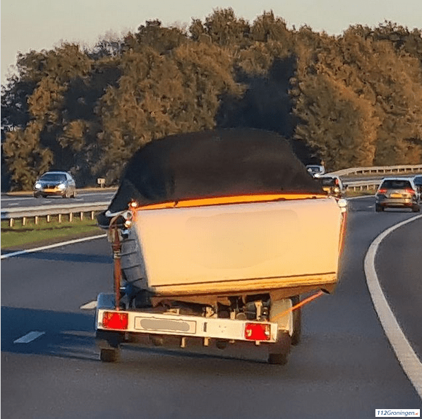 Westerbroek – Gisteren werd door de Politie een bestuurder met deze trailer met boot van de weg gehaald. De combinatie reed slingerend over de A7 bij Westerbroek (Gr).