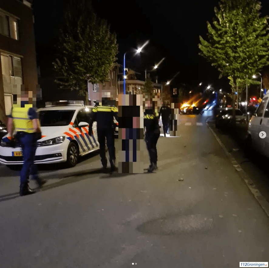 Handhavers van Groningen waren in de buurt en gingen naar de laatst bekende locatie. Daar werden zij gewenkt door een groep personen die aangaven de eigenaren van de reclameborden te zijn. Zij gaven aan dat de twee personen die de borden hadden gestolen hen ook ernstig had bedreigd met de dood. Zij gaven aan dat de twee verdachten een woning binnen waren gegaan. Toen er door het raam naar binnen werd gekeken zagen wij dat één van de twee verdachten een samoerai zwaard pakte en vervolgens richting de voordeur liep. Hierop werd gelijk afstand van de woning genomen, omstanders op veilige afstand gestuurd en met spoed de politie erbij gevraagd.
