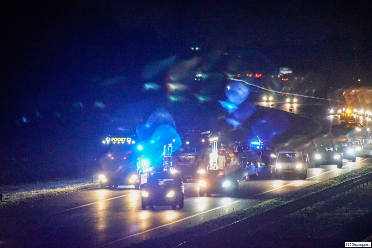 Hoeveel auto’s er precies bij het ongeval betrokken zijn is onbekend, wel is zeker dat één voertuig betrokken is en op gas rijd. Ook de brandweer van Groningen werd opgeroepen, dit uit voorzorg vanwege het voertuig die op gas rijd. Rijkswaterstaat heeft één rijstrook afgesloten. Door het ongeval ondervond het overige verkeer enige vertraging. Een ter plaatse gekomen ambulance gaat de eventuele bestuurder(s) controleren op verwondingen. Of er iemand mee moest naar het ziekenhuis is niet bekend. Een berger zal de afsleep verzorgen.