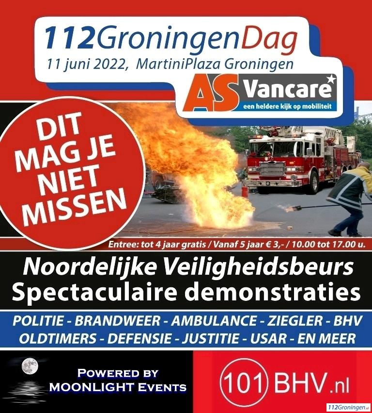Op zaterdag 11 juni 2022 vindt voor de derde keer de 112GroningenDag plaats in-en om de MartiniPlaza in Groningen. Van 10.00 tot 17.00 uur zijn er diverse hulpverleningsinstanties en geven talrijke spectaculaire demonstraties van vele hulpdiensten en er is een een grote informatie / veiligheidsmarkt. Op het Horecaplein kunt terecht voor een hapje en een drankje. U bent van harte welkom!! De 112GroningenDag wordt mede mogelijk gemaakt door hoofdsponsor A&S Vancare en subsponsor 101BHV.nl.