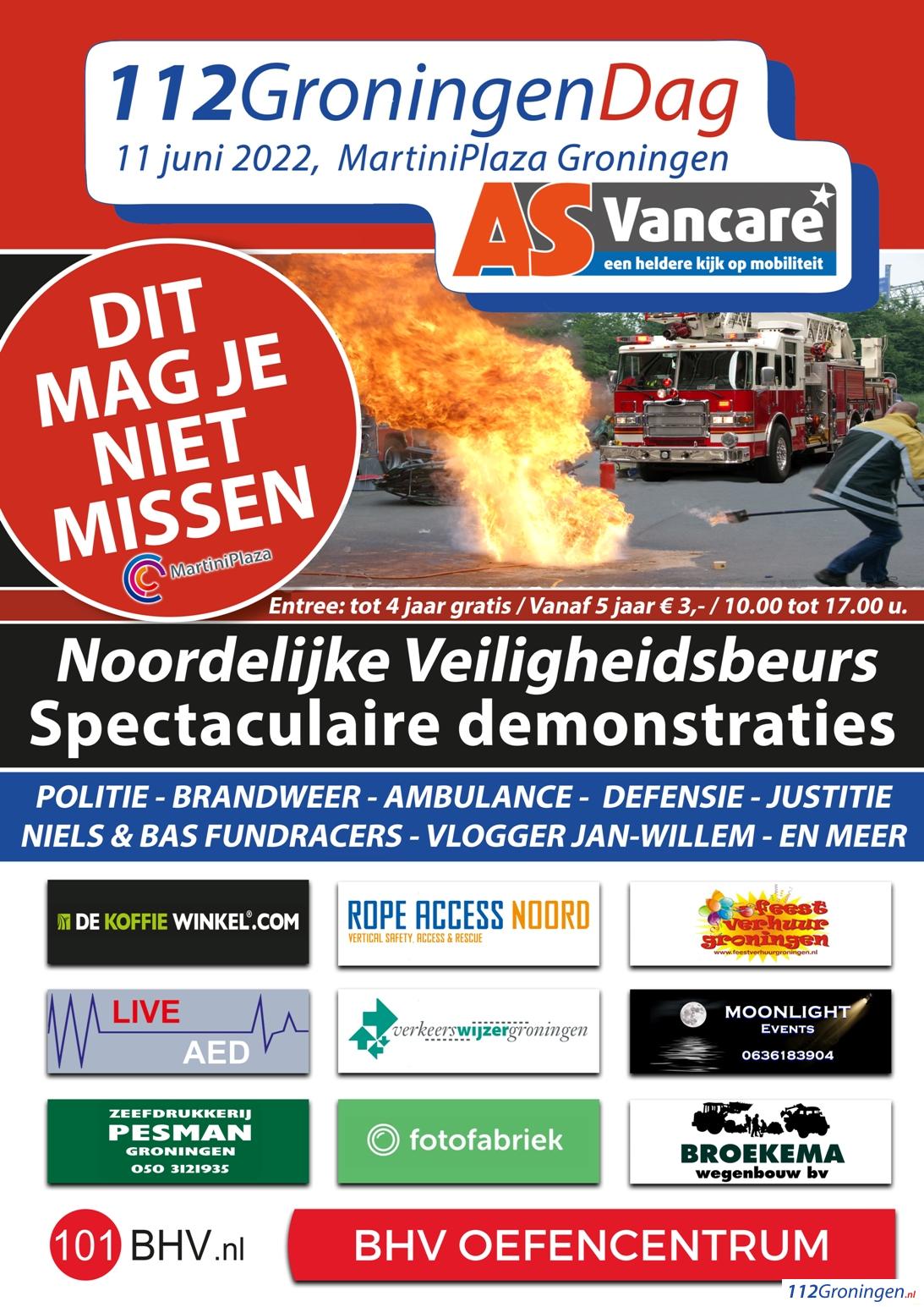 Op zaterdag 11 juni 2022 vindt voor de derde keer de 112GroningenDag plaats in- en om de MartiniPlaza in Groningen. Van 10.00 tot 17.00 uur (3 euro entree,zie poster) zijn er diverse hulpverleningsinstanties en geven talrijke spectaculaire demonstraties van vele hulpdiensten en er is een een grote informatie / veiligheidsmarkt. Op het Horecaplein kunt terecht voor een hapje en een drankje. U bent van harte welkom!! De 112GroningenDag wordt mede mogelijk gemaakt door hoofdsponsor A&S Vancare en subsponsor 101BHV.nl.