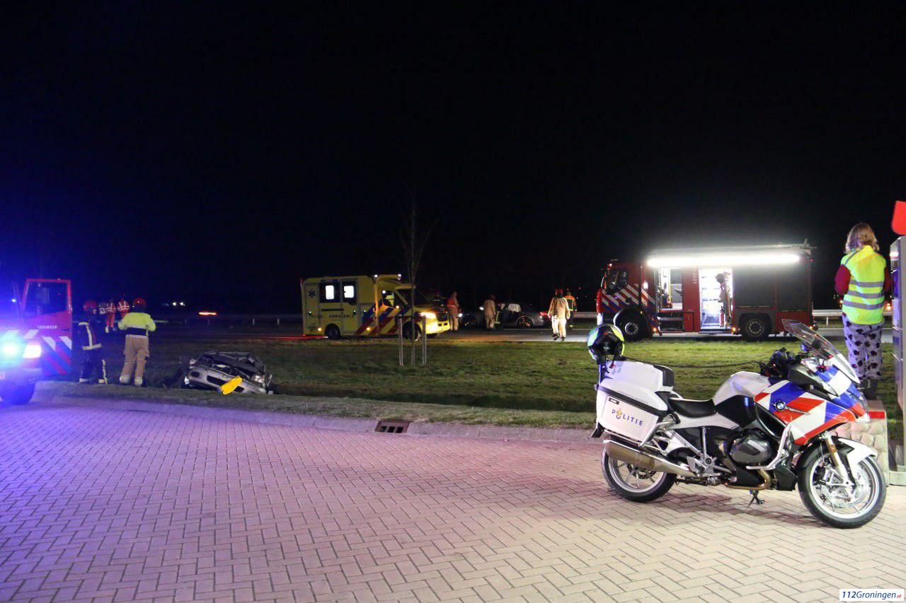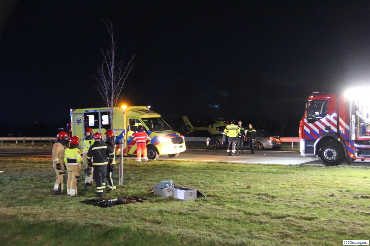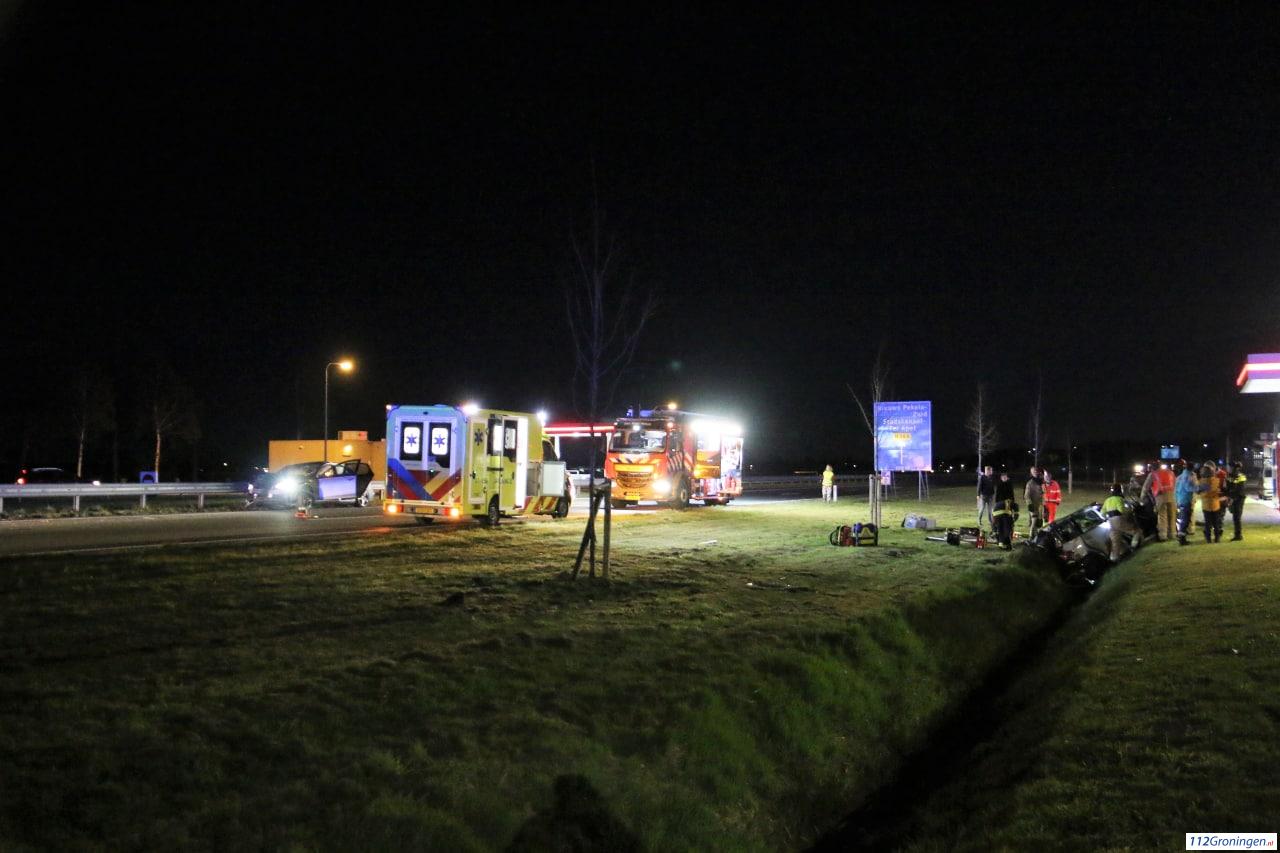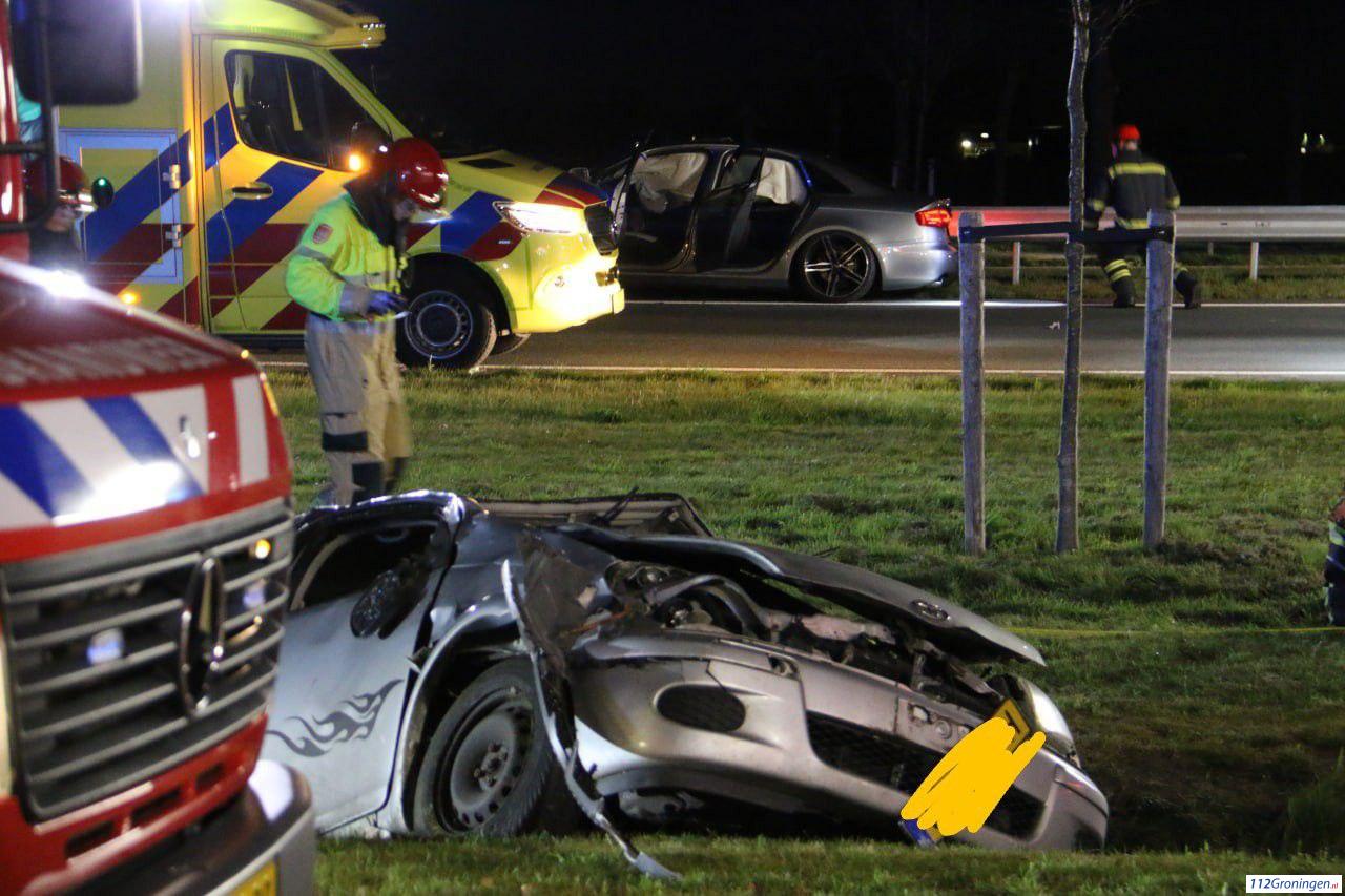 Update 1e paasdag: Er raakten twee personen gewond geraakt meldt Rtvnoord. Het gaat om een 51-jarige vrouw en een 11-jarige jongen uit het Gelderse Renkum, meldt de politie. Bij het ongeval was ook een andere auto betrokken, die tegen de vangrail stond. De bestuurder van die auto was niet meer aanwezig toen de hulpdiensten arriveerden. Even later hield de politie de bestuurder alsnog aan. Het gaat om een 25-jarige man uit Sappemeer zegt Rtvnoord.