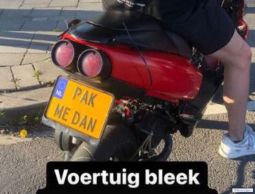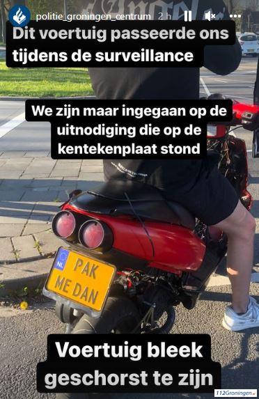 Groningen – Politieagenten hebben op Paaszondag een scooter in beslaggenomen. De scooter voerde een kentekenplaat met daarop de tekst ‘Pak me dan’.