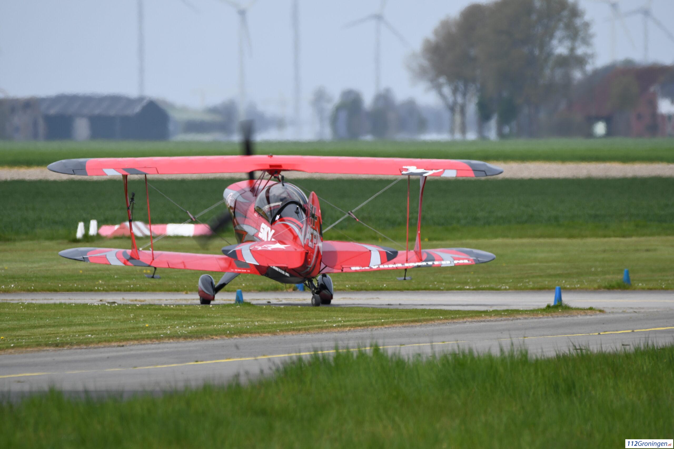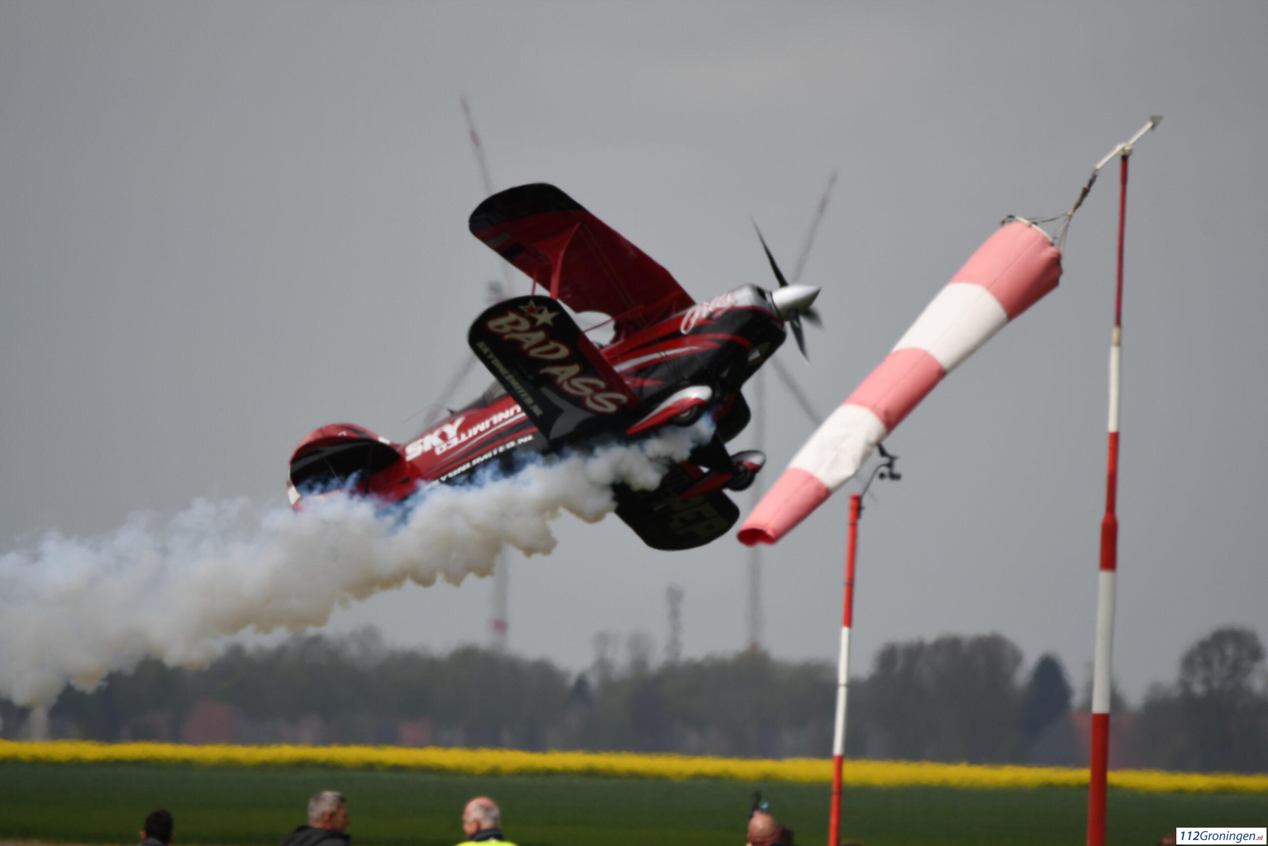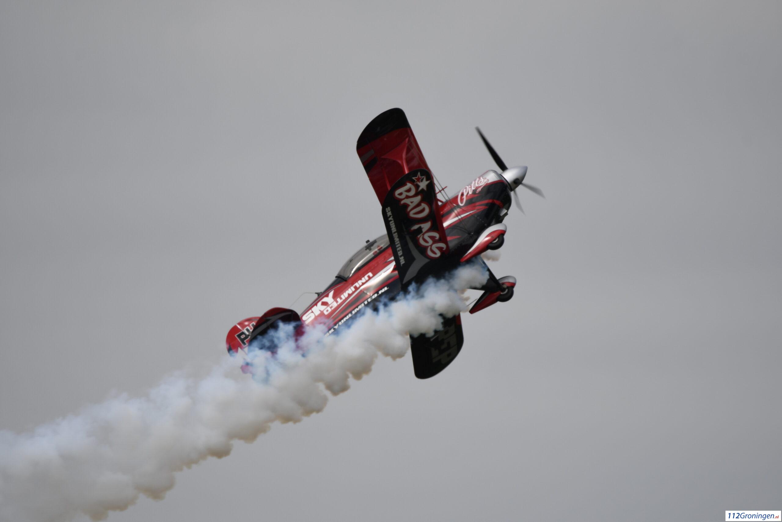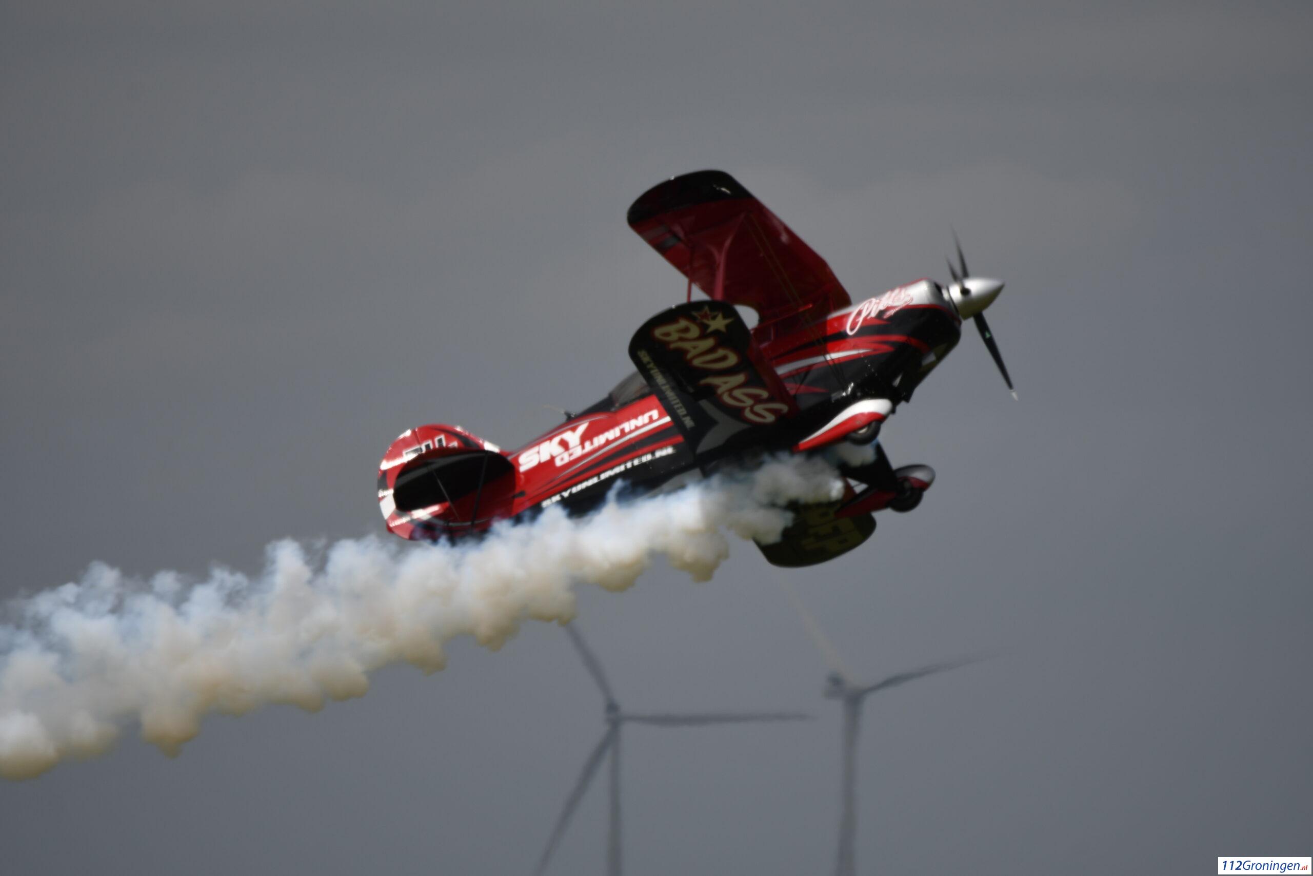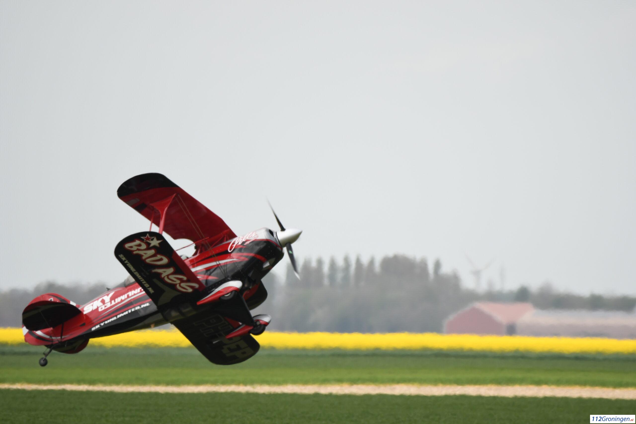 publiek in ontvangst neemt. “Mijn benen voelen aan als pap en ik heb spierpijn tot achter mijn oren maar het was fantastisch om te doen.” Honderden toeschouwers zagen de rode ‘Pitts Special’ de PHPEP naar ruim 300 meter hoogte, oftewel 1000 ft. klimmen om vervolgens bijna stijl naar beneden te duiken en weer te landen. De Nederlandse stuntpiloot en vliegschoolhouder Dirk Evers van Sky Academy uit Lelystad maakt er een prachtig spektakel van.