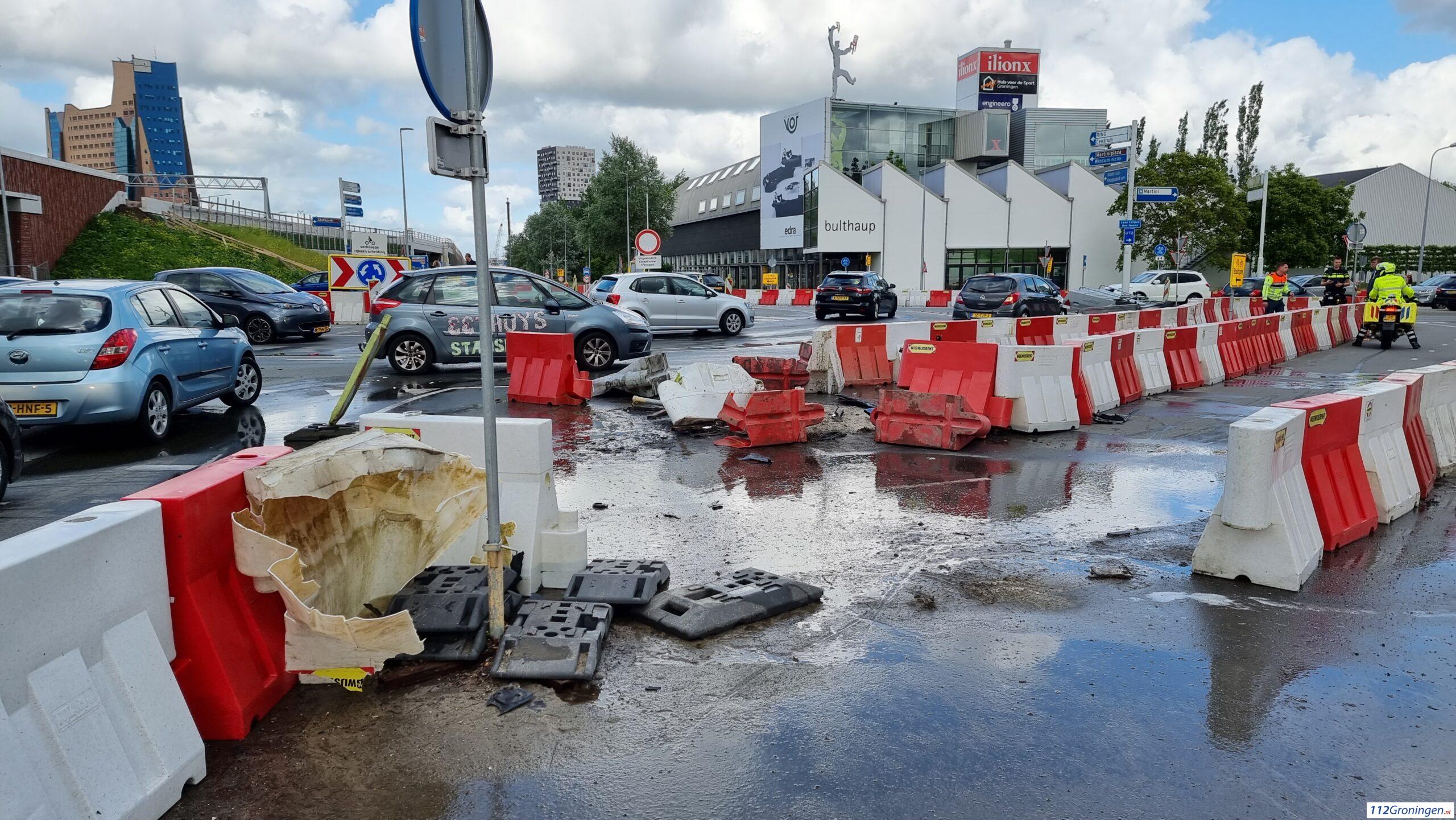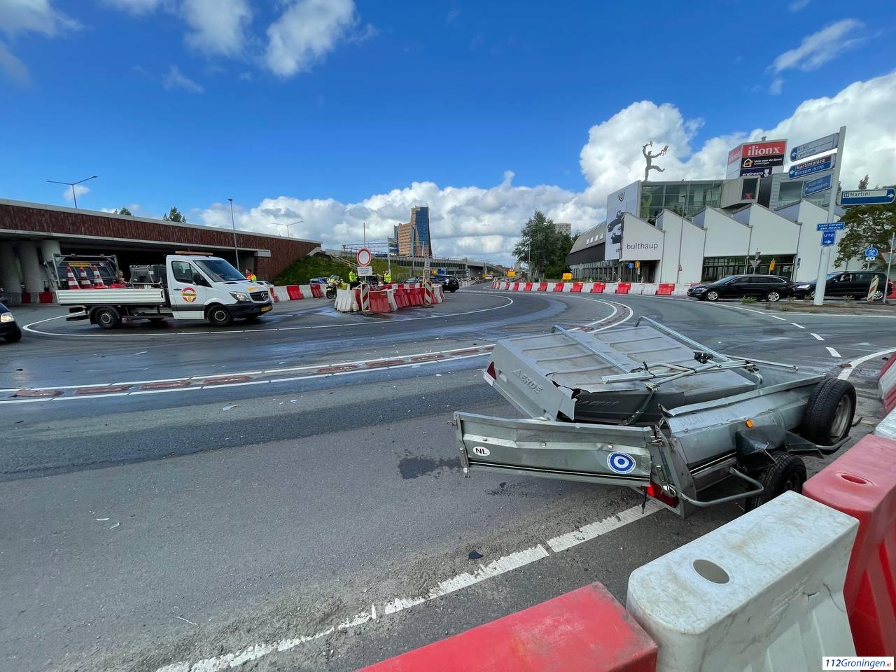 Daarbij is 1 auto dwars door de barriers heen gereden met een aanhanger. De schade is fors aan de auto met aanhanger, deze worden afgesleept door een berger.