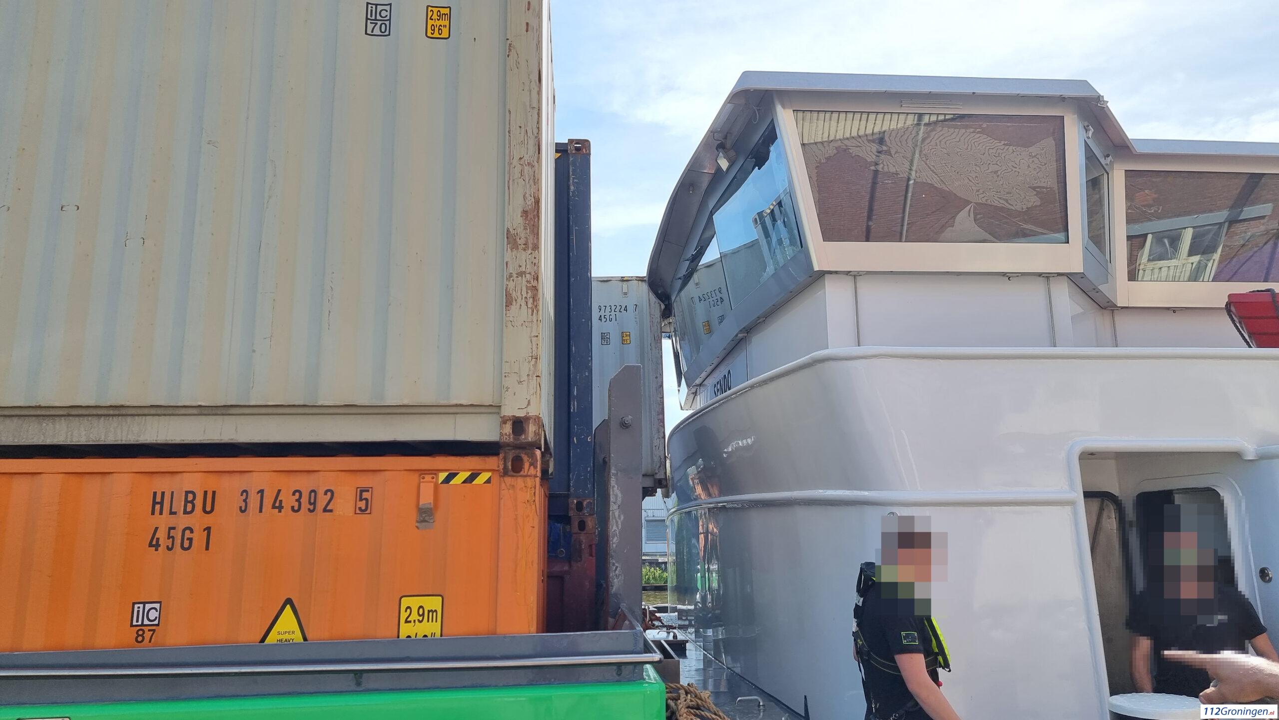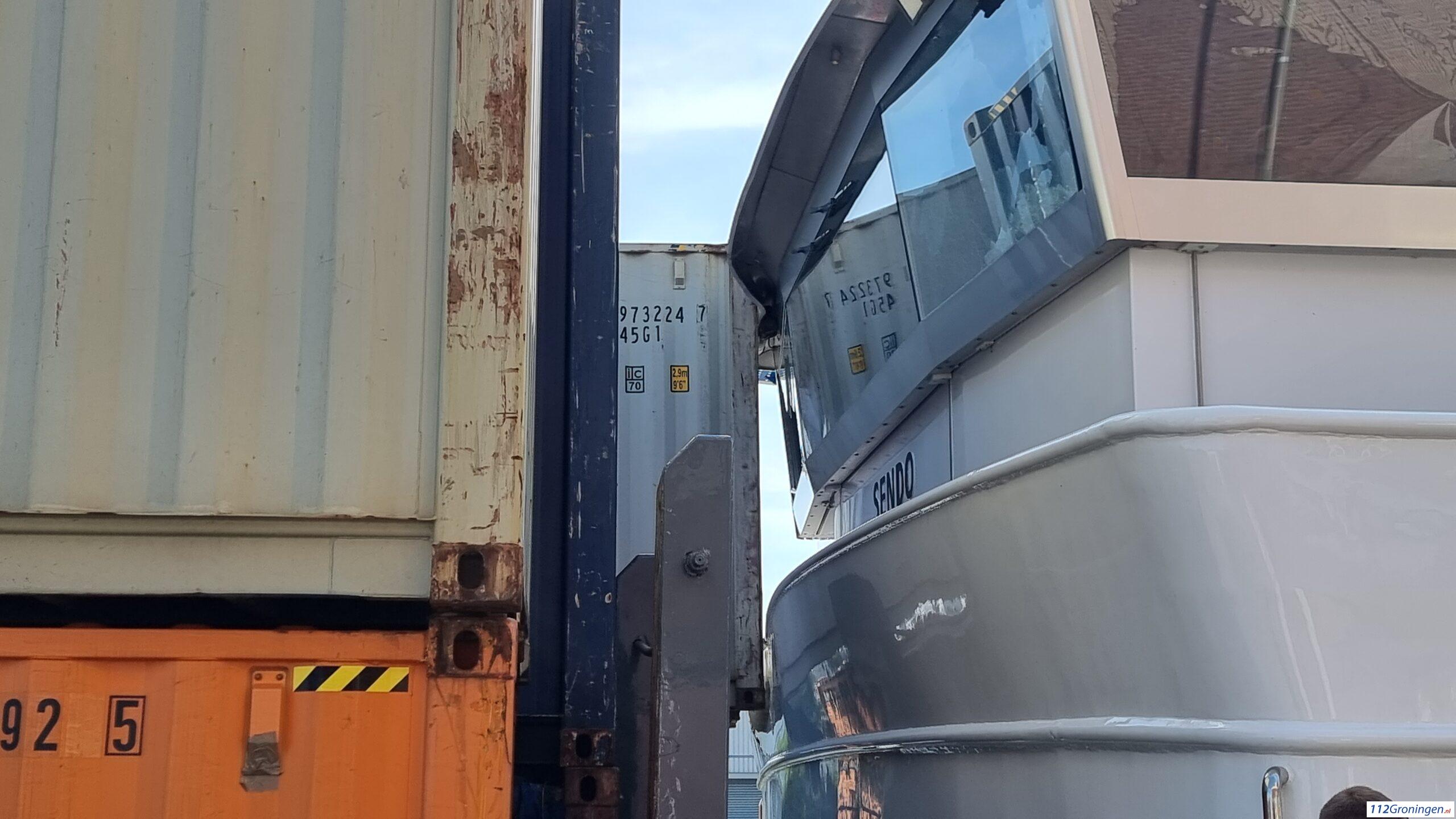 De ramen van de stuurhut zijn kapot door een container die verschoven is. Het is de zoveelste boot die een brug in Groningen ramt. De oorzaak is nog niet bekend.