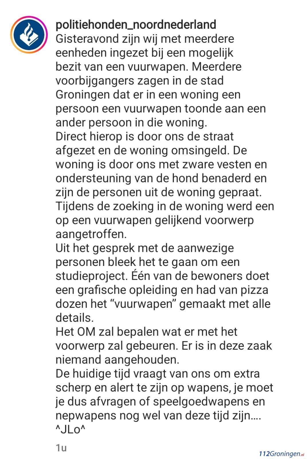 Volgens een politiewoordvoerder werd in de woning een ‘overduidelijk in elkaar geknutseld nepwapen’ gevonden. ‘We gaan heel serieus om met dit soort meldingen Het nepvuurwapen is in beslag genomen. Niemand is aangehouden, zie actuele video hieronder. Meer hierover en bron Rtvnoord.nl.