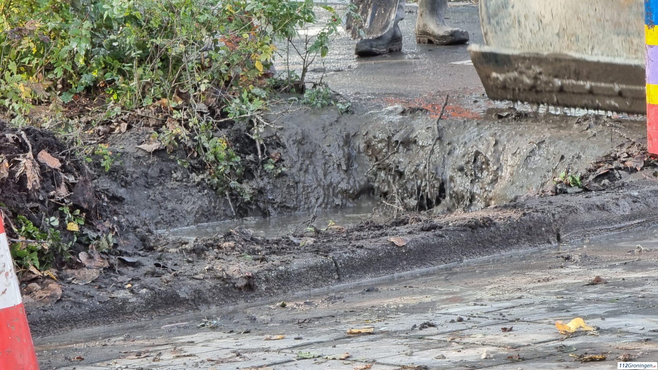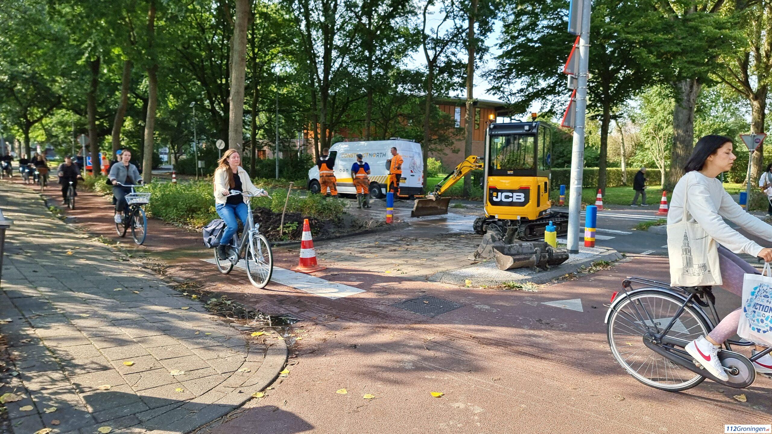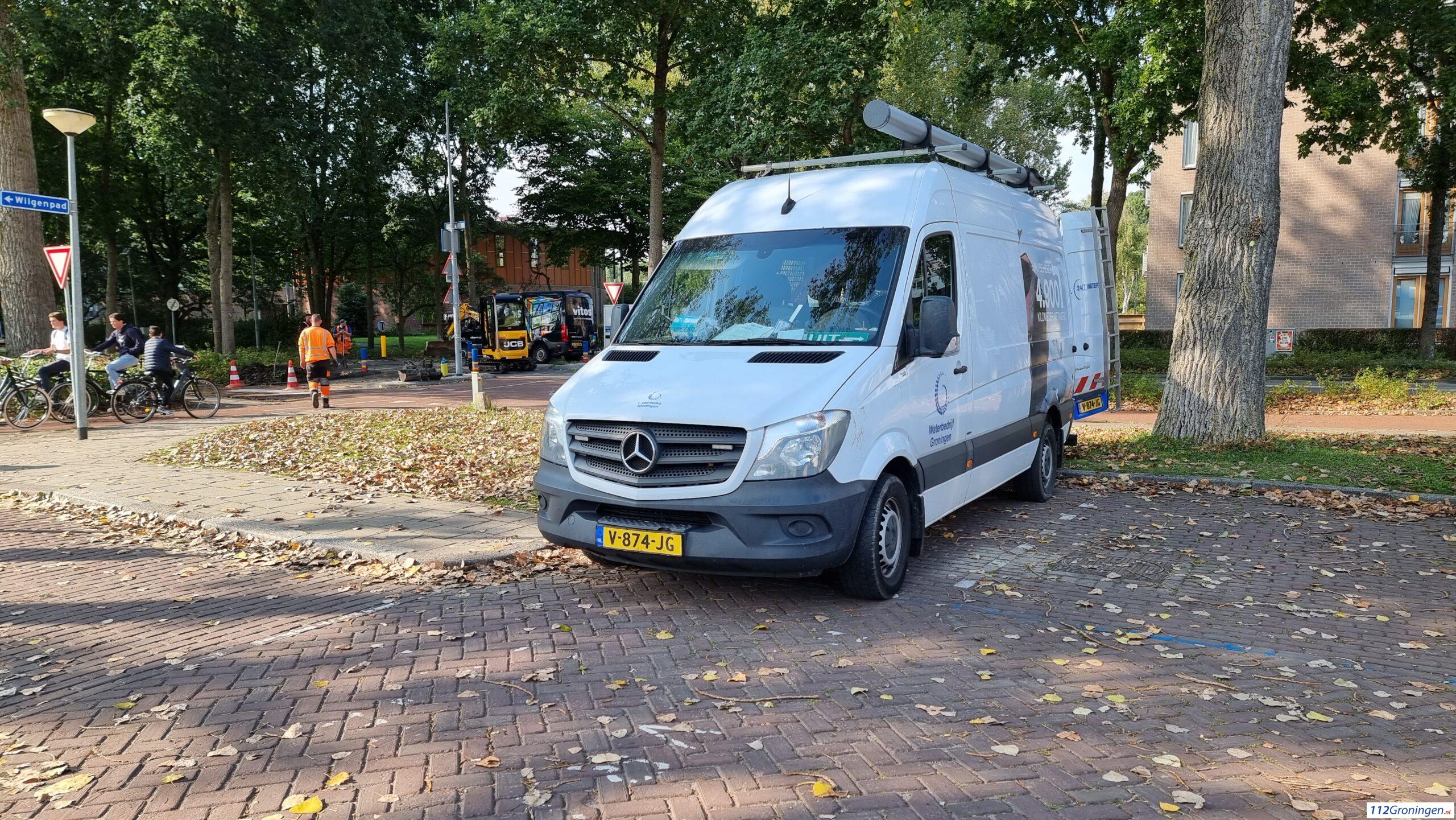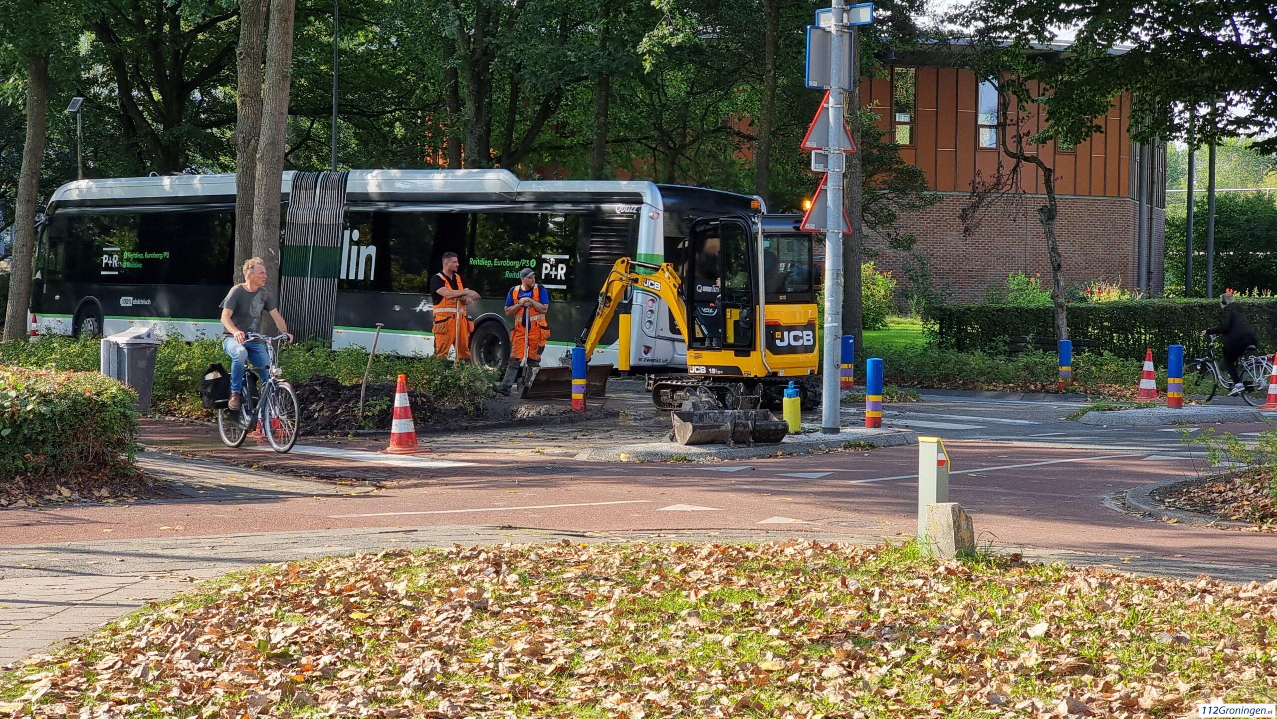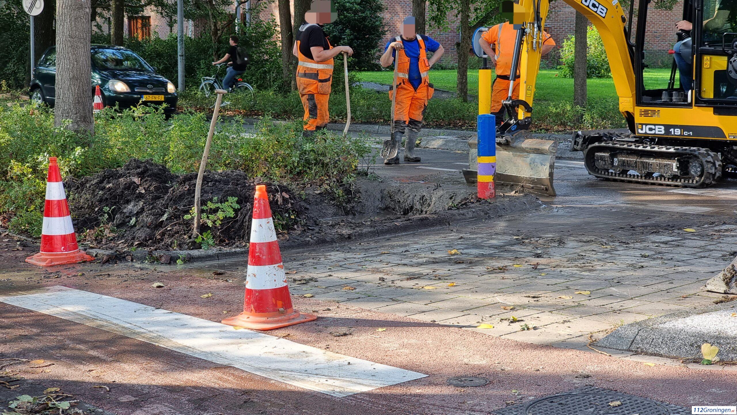Verkeersregelaars regelen ter plaatse het verkeer. Het waterbedrijf Groningen is ter plaatse voor reparatie en herstel.