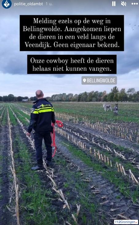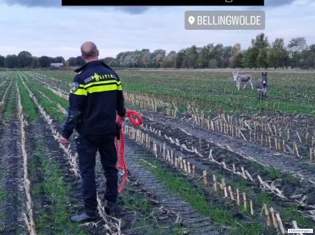 Bellingwolde- Langs de Veendijk in Bellingwolde liepen maandagmorgen twee ezels los op de weg. Toen de politie arriveerde liepen ze in een stuk land.