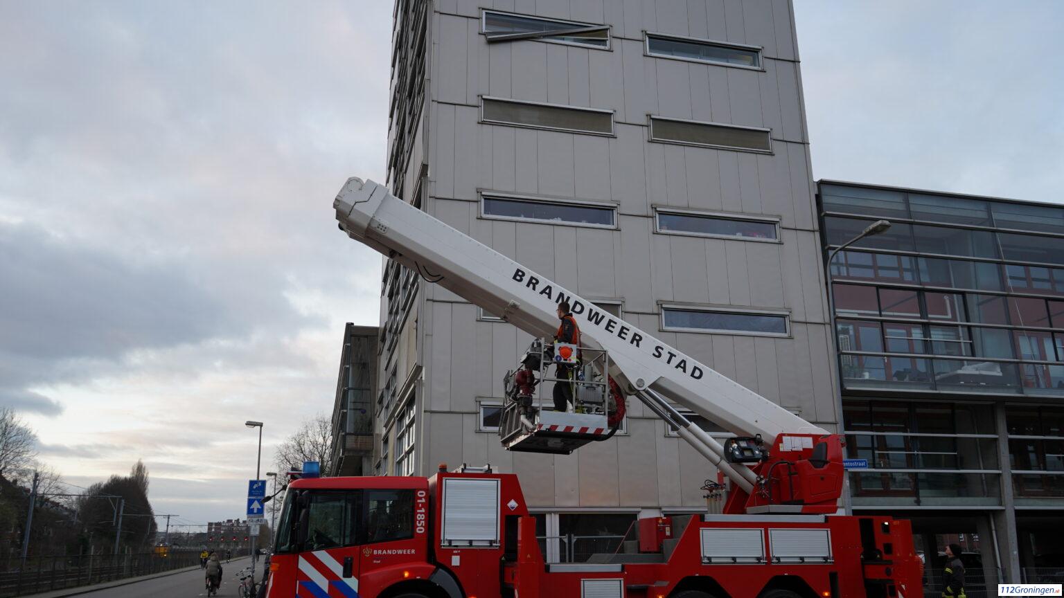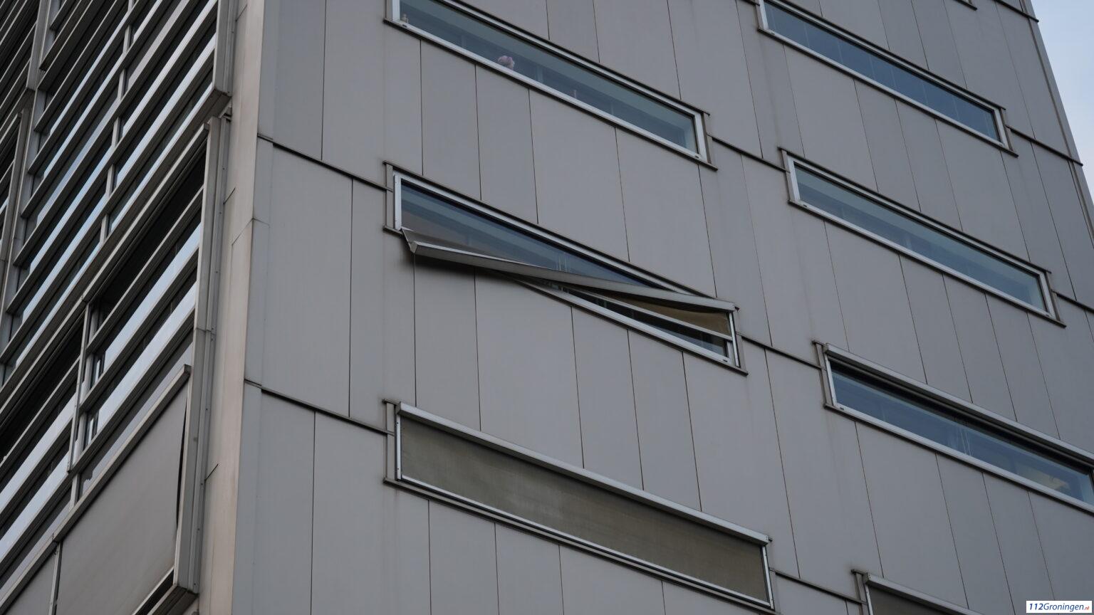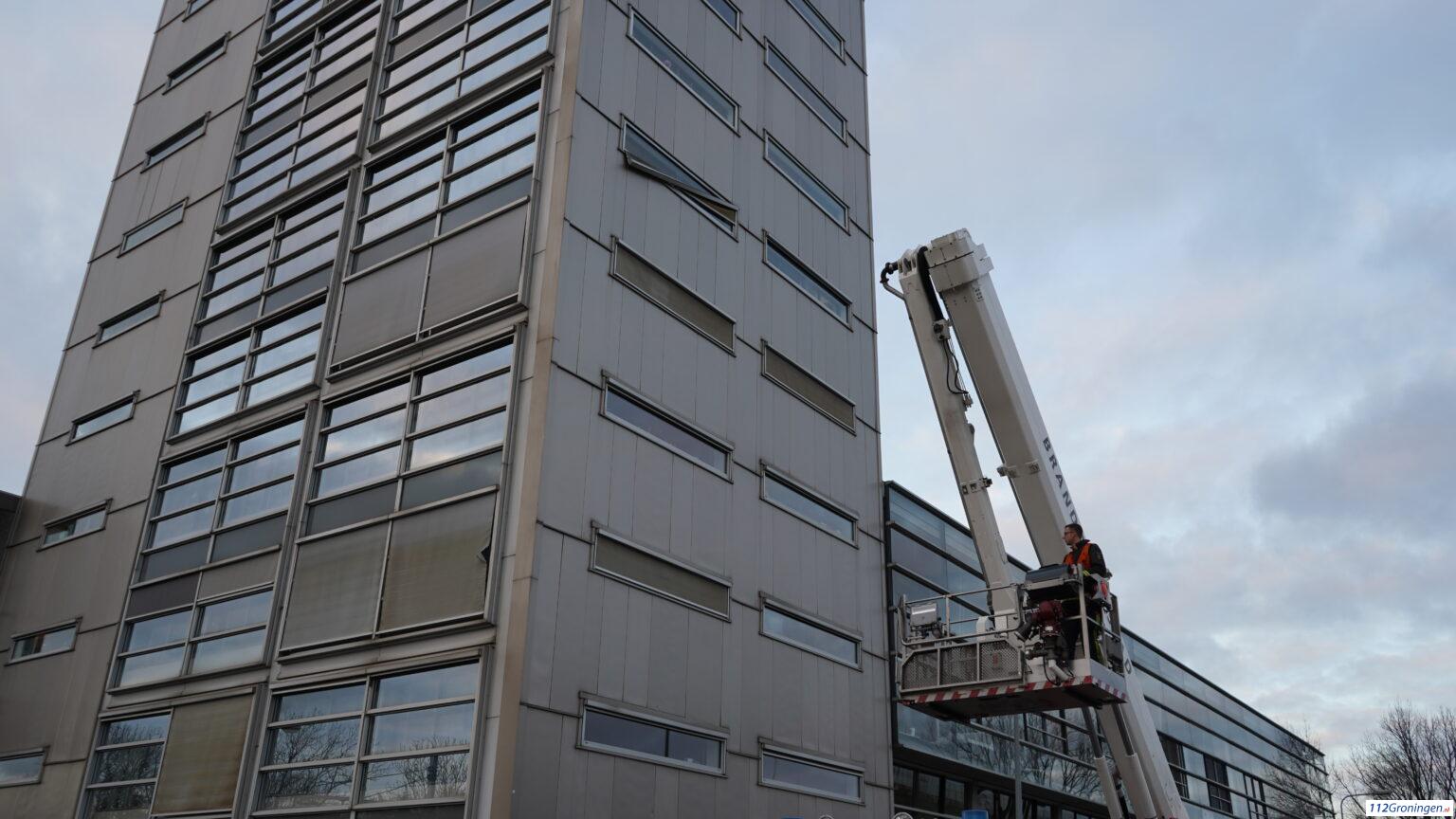Groningen- Zaterdagmiddag is er aan het gebouw op de hoek Verlengde Lodewijkstraat/Esperantostraat een zonnescherm losgekomen van de gevel. Dit zorgde voor een gevaarlijke situatie.