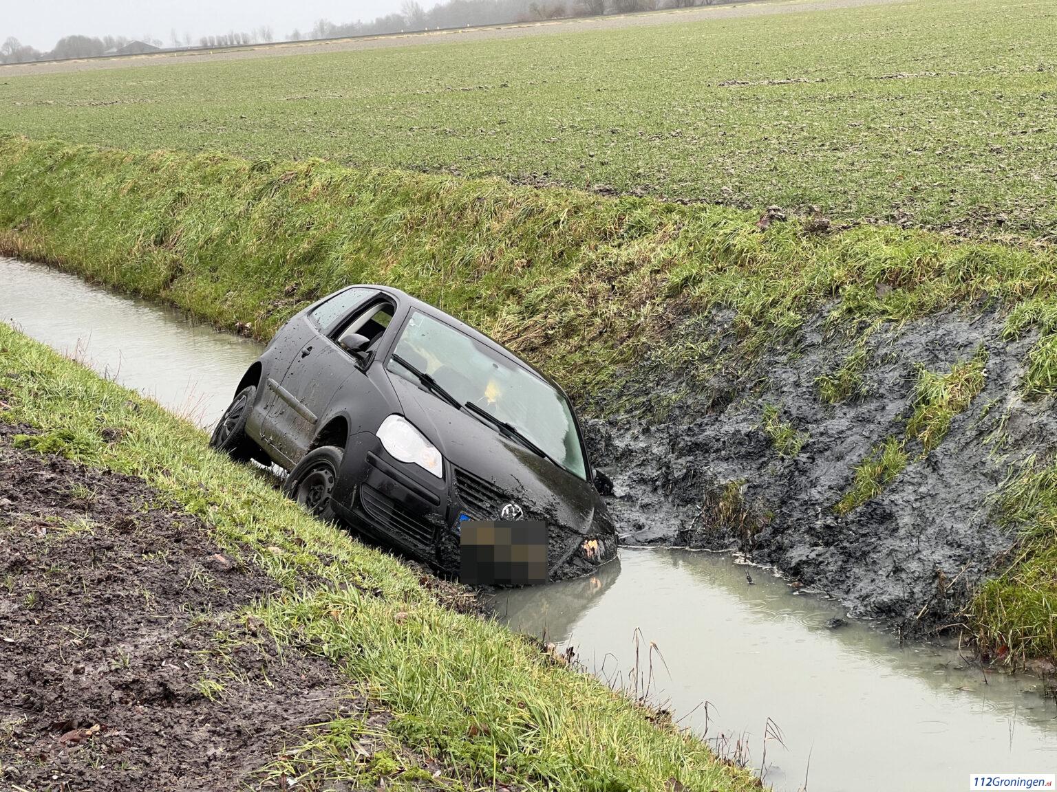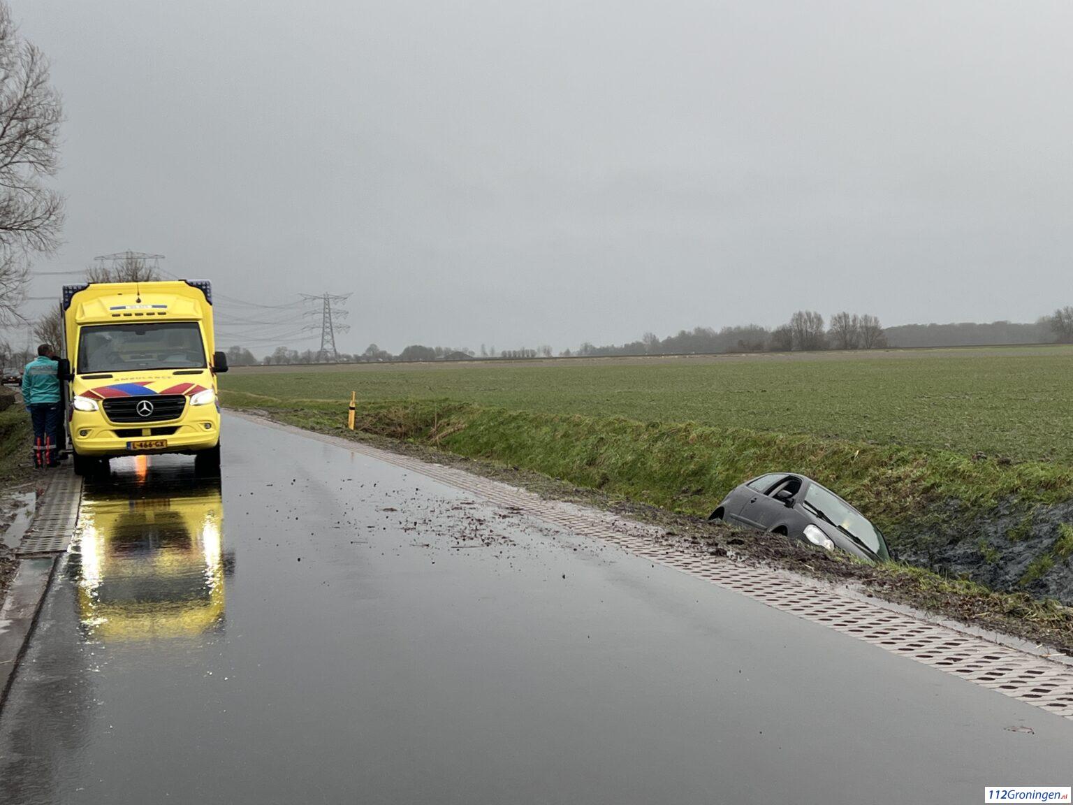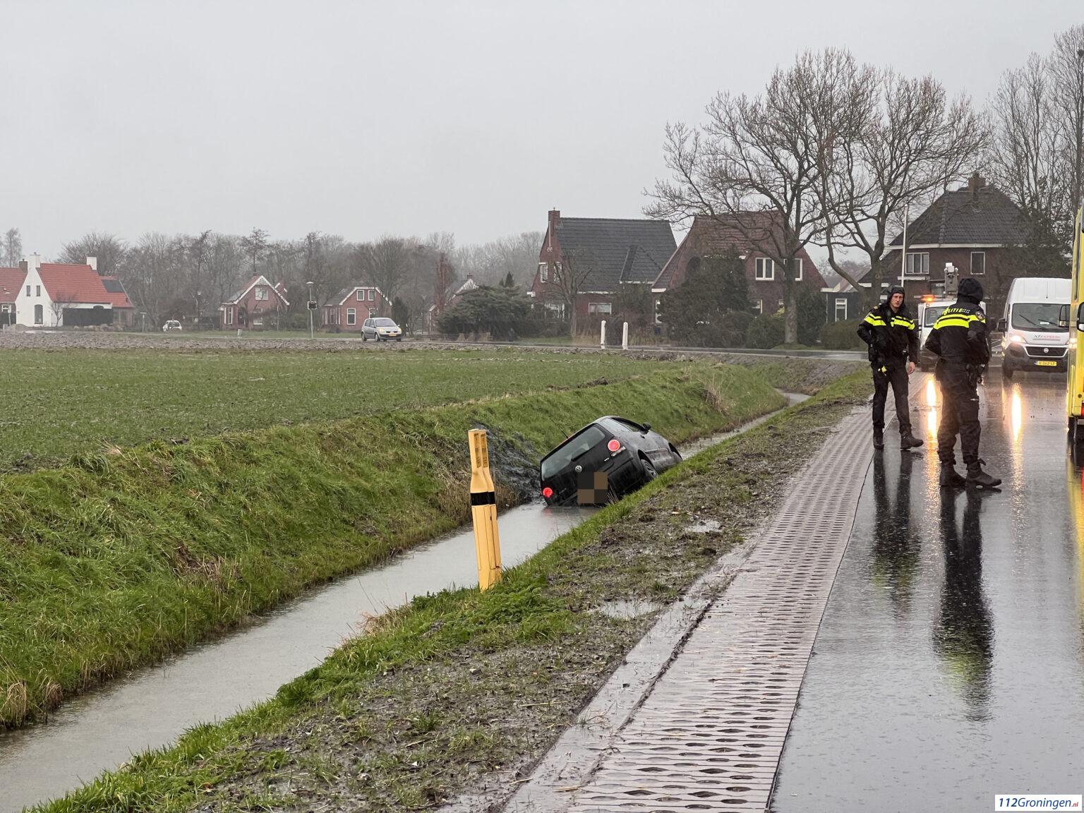 Oosterwijtwerd –  Aan de Damsterweg in Oosterwijtwerd is woensdag rond 12:15 uur een auto van de weg geraakt. Vermoedelijk door gladheid ging het mis, er waren opeens forse regen en hagelbuien.